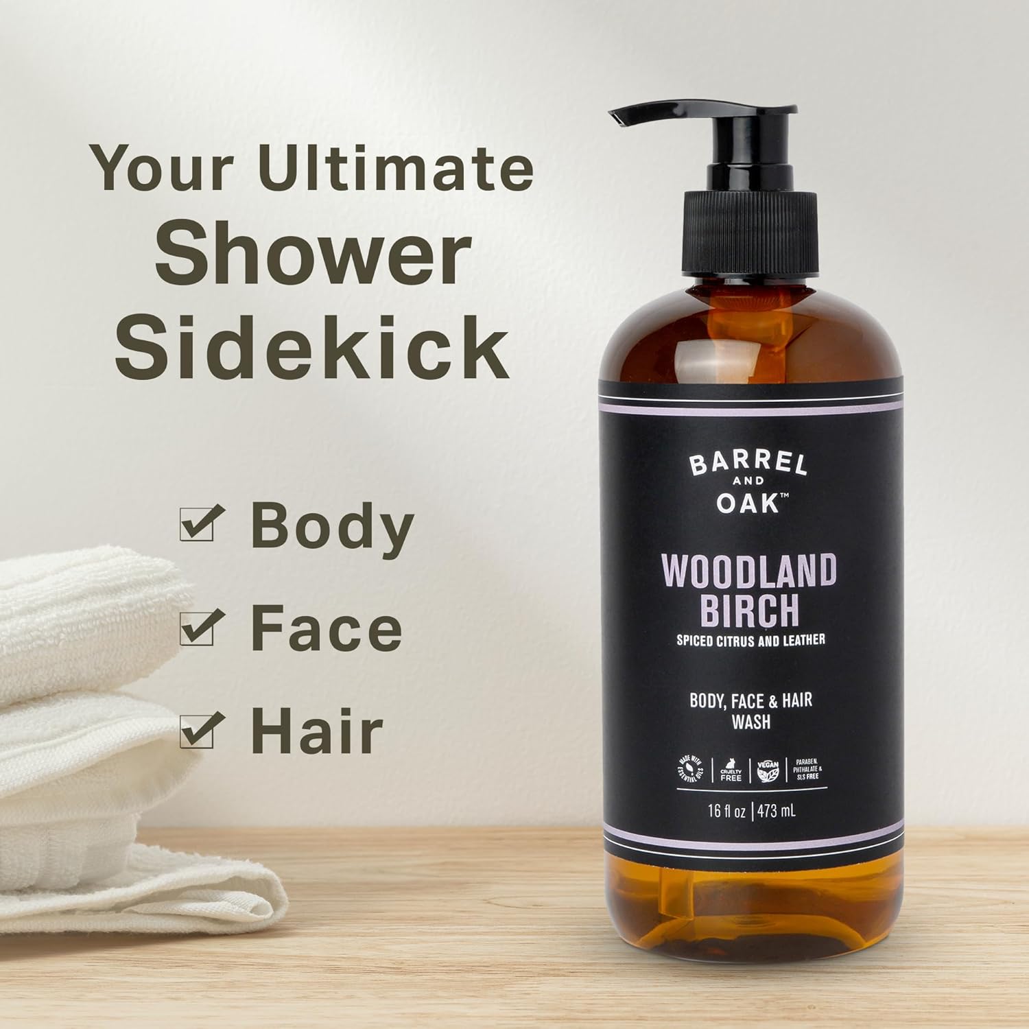 Barrel & Oak All-in-One Wash for Face, Hair, & Body, Vegan & Hydrating Face, Shampoo and Body Wash for Men, Grooming Kit Gifts for Men, Woodland Birch, 16 oz