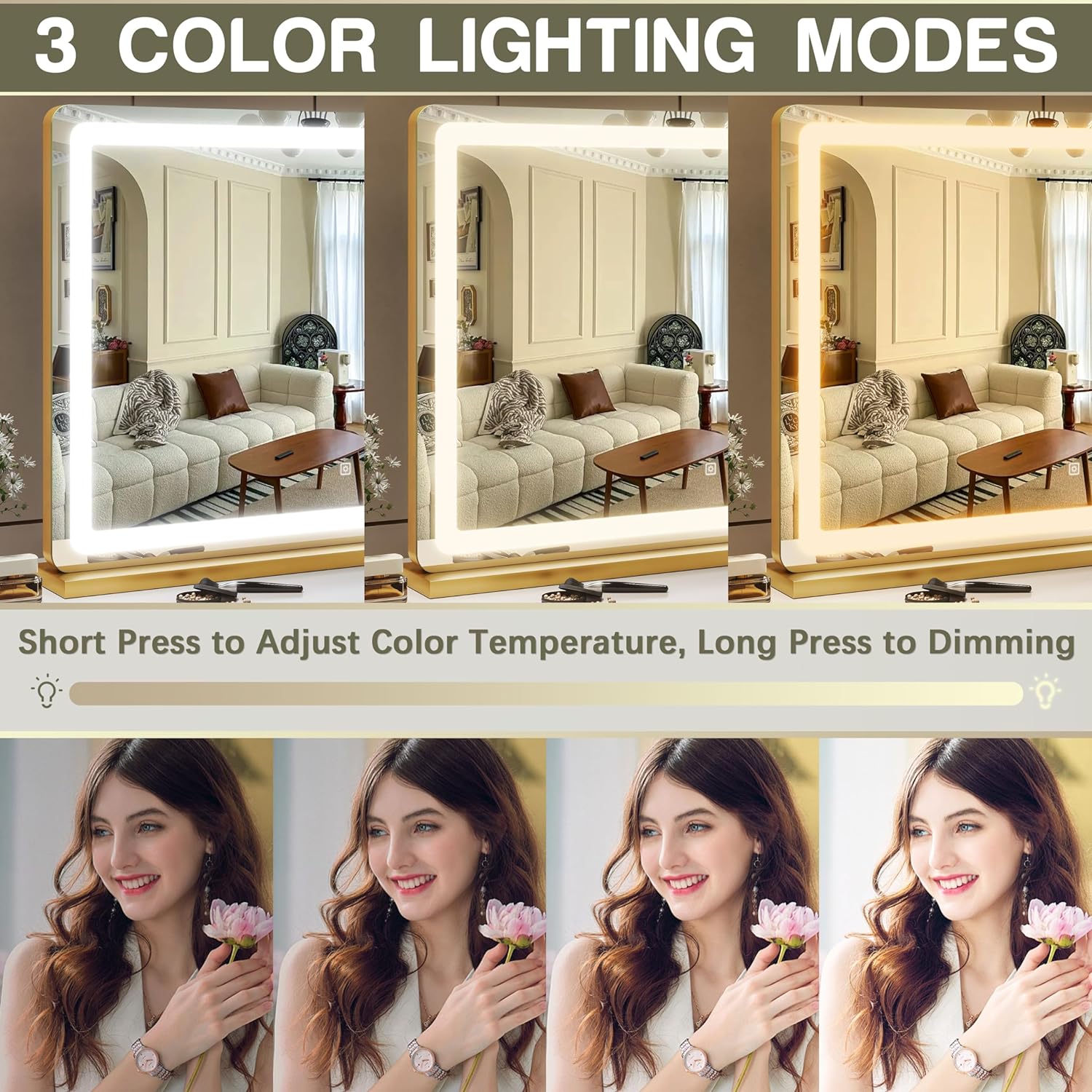 Gold Vanity Mirror with Lights, 32" x 22" Large Lighted Vanity Mirror with Dimmable 3 Modes, LED Makeup Mirror, USB Charging Port, Tabletop or Wall-Mounted