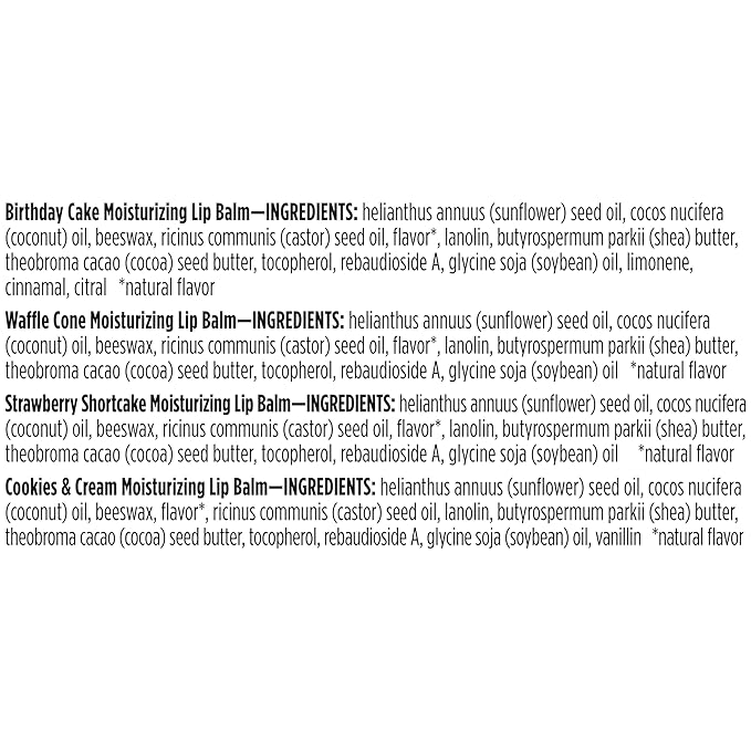 - NOSTALGIC PARTY FLAVORS: Remember the birthday party flavors of childhood with these fun flavored lip balms, including Birthday Cake, Waffle Cone, Strawberry Shortcake, and Cookies and Cream