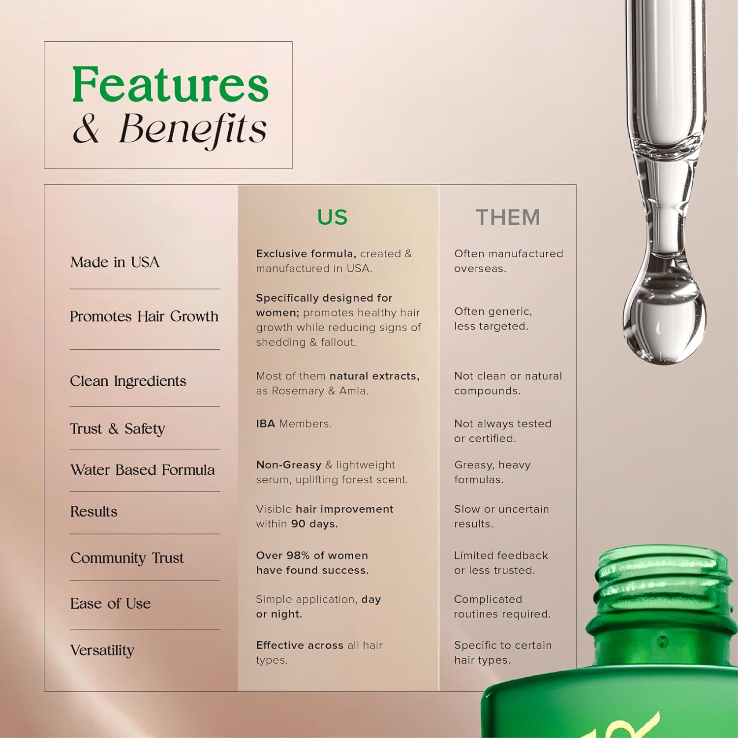 - LAB TESTED & IBA CERTIFIED MEMBERS: Made in the USA, developed by specialists & rigorously tested under strict laboratory conditions, our hair serum for hair growth is member of the International Beauty Association (IBA). Trusted by over 100,000 women & men, this formula is tailored to nourish hair, promoting a healthy, thick, & shiny appearance. Paraben Free & Sulfate Free.