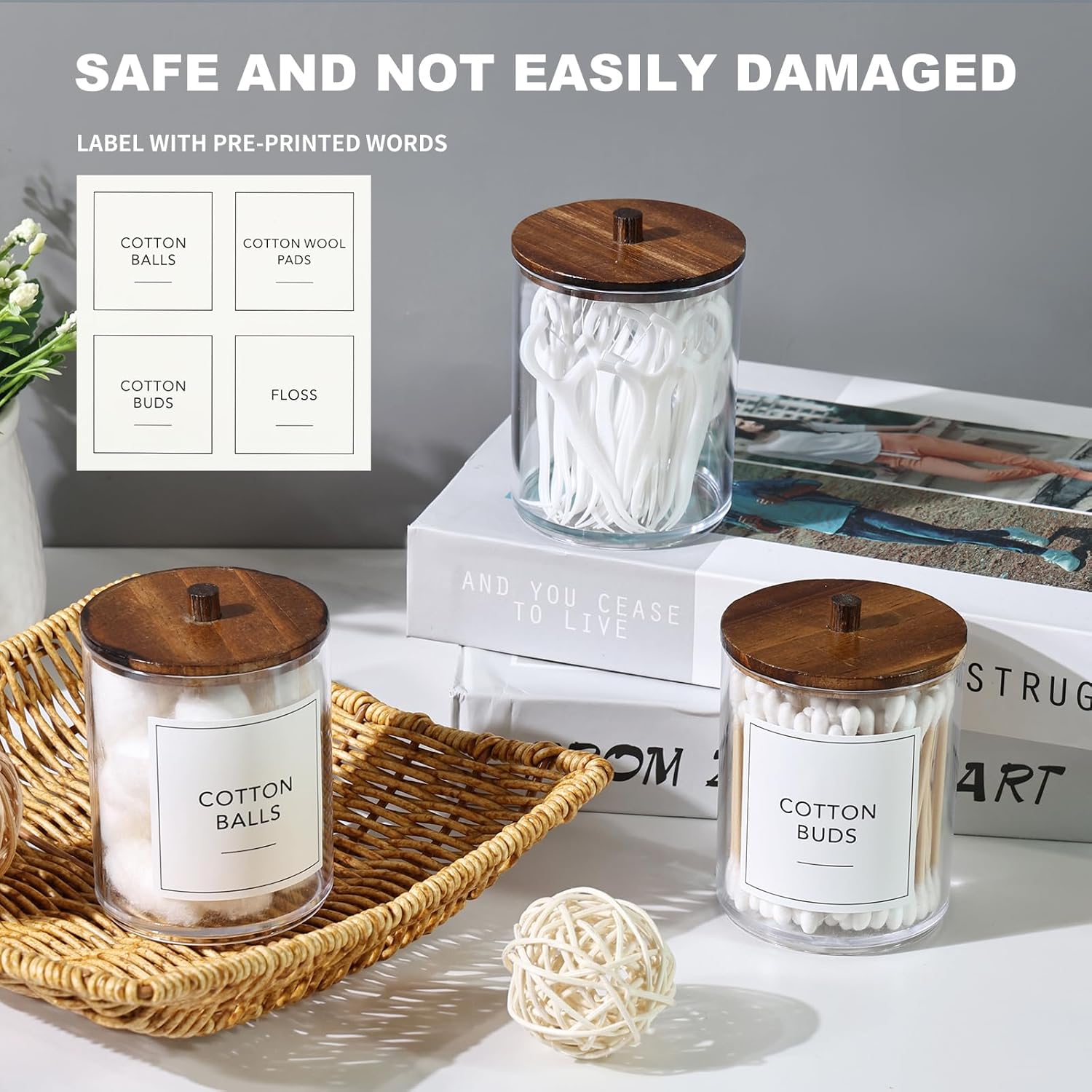 - PACKING INCLUDE: The qtip organizer set includes 4 packs q tip apothecary jar with wooden lids [ Diameter - 2.75 inches ], with 4 white labels(Cotton Balls, Cotton Wool Pads, Cotton Buds, Floss).