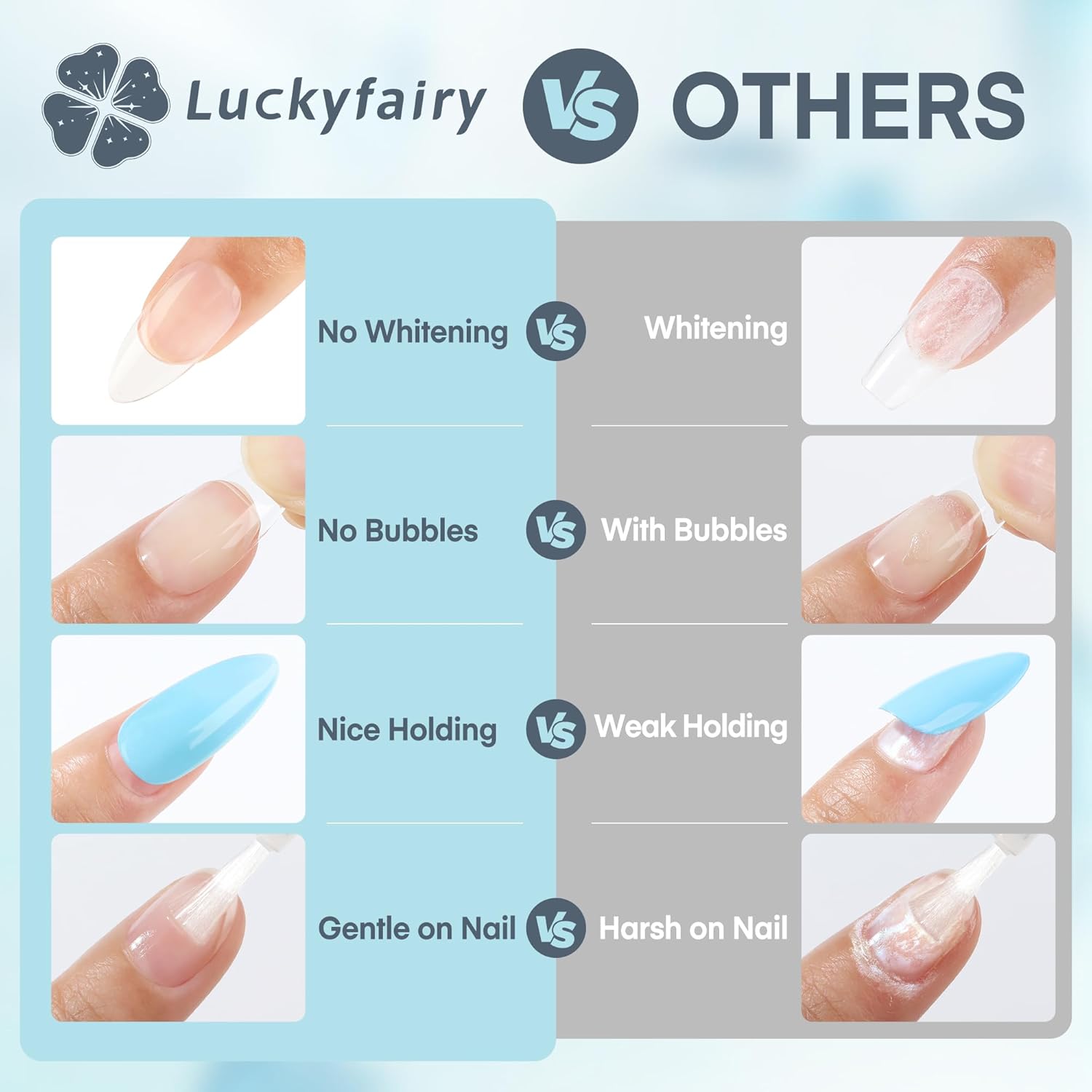 - 【Quick-drying & Long-lasting】This nail glue strong has excellent adhesion and is very strong and durable when applied to the nails, ensuring that soft gel nail tips stay securely attached for 7-15 days. The acrylic nail glue does not need nail lamp; simply press for 10-15s to attach the nails.