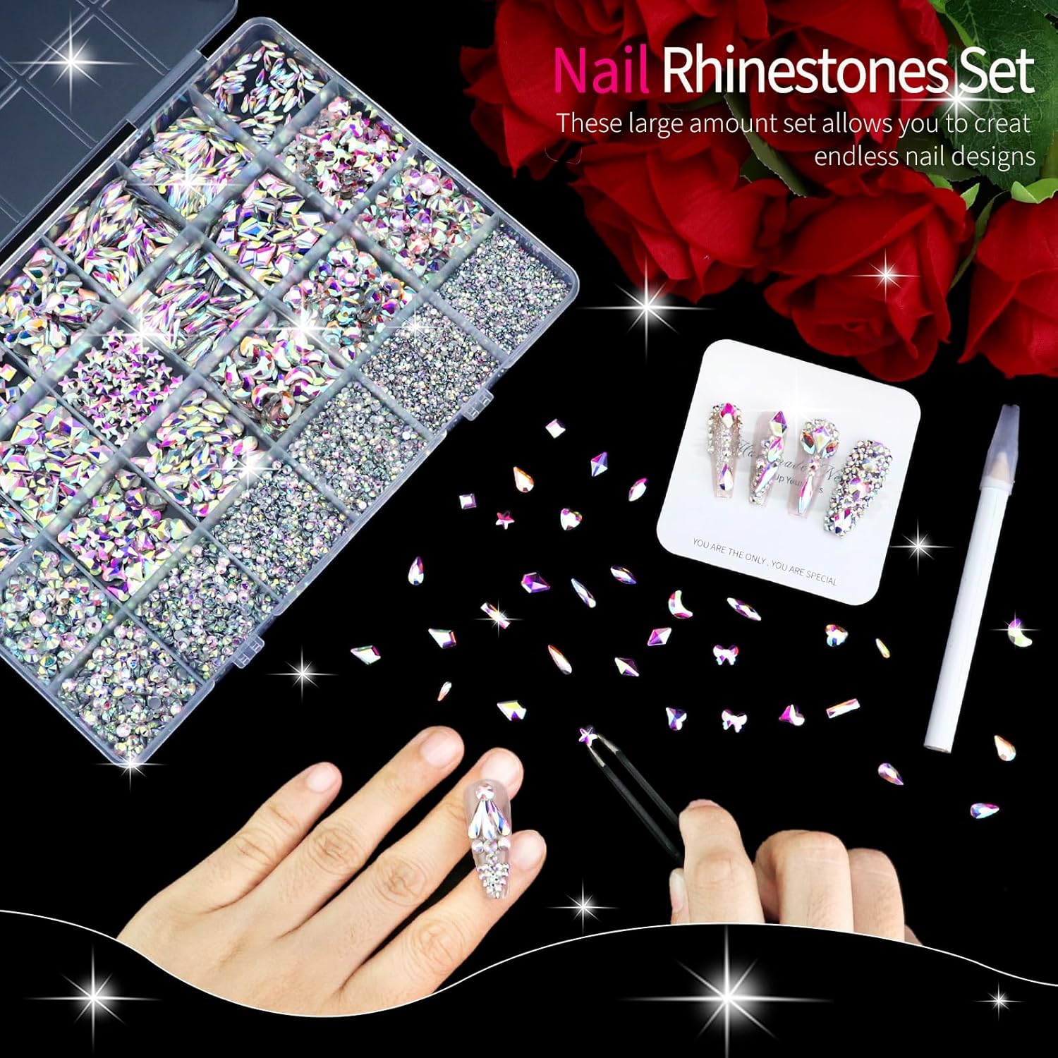 - 🌺 You Will Receive: A large box of crystal ab nail crystal rhinestone set, includes 16 styles of 800pcs special-shaped diamond, 50pcs/style; 5200pcs round flatback rhinestones in 8 sizes, with one wax picker pencil and one pair of tweezers.