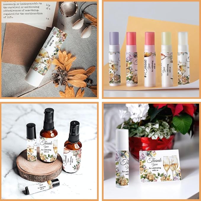 - Ample Quantity--You will get a total of 4 different styles of Champagne pattern lipstick tube stickers, printed "thank you for celebrating with us", 25pcs/style, 100pcs in total, size about 44x54mm/1.7~2.1 inch and 54x44mm/2.1~1.7 inch.