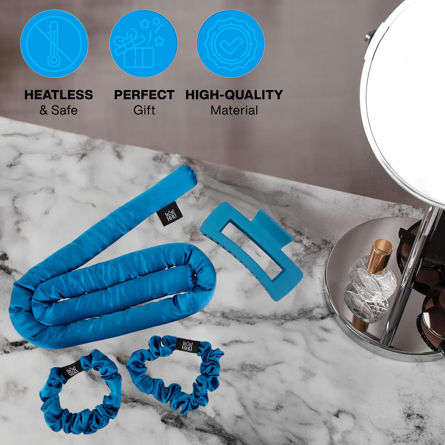 - Satin Heatless Curling Set: This beautiful curling rod set comes in different colors. The heatless curling rod set comes as a complete 4 in 1 set of satin curling rod, 2 scrunchies, and a hair clip. So you don't have to buy extra hair accessories. to complete your look.