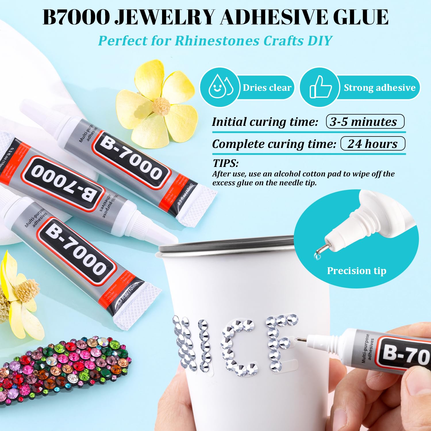 - 💎STRONG B7000 GLUE FOR GEMS -- These Non-Hotfix rhinestones are not self-adhesive and need to be used by glue. The equipped B7000 glue has strong adhesion and dries clear. It has a precision needle for easy application. For first use, you can leave the glue head up for a few minutes before opening to avoid overflow. After use, the needle needs to be cleaned with an alcohol wipe so as to avoid a mess.