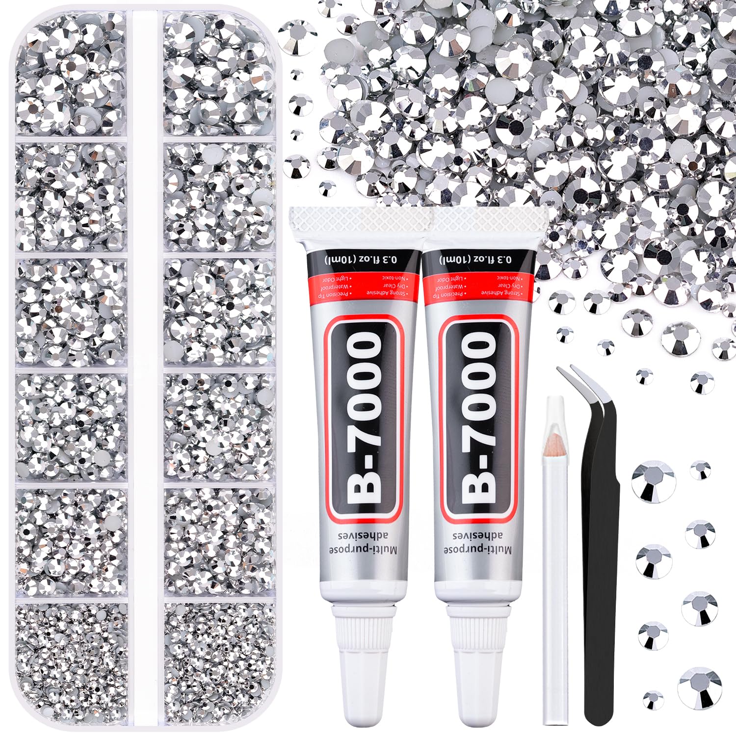 - 💎WHAT YOU WILL GET -- The package includes 1 box of flatback rhinestones with 12 grids in diffrent sizes:2mm x 2 grids, 3mm x 4 grids, 4mm x 4 grids, 5mm x 2 grids. 1 tweezers for large size gems, 1 pickup pen for small size gems. 2 B7000 adhesive jewels glue for jewelry making.This rhinestone kit makes it easy for you to make any craft you like, and will bedazzle your artworks!