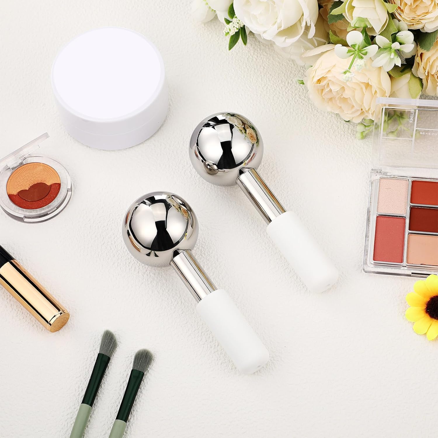 Baderke 2 Pcs Ice Globes for Face Stainless Steel Cooling Globes Unbreakable Cooling Roller Women Ice Balls Cryo Sticks Face Skin Care for Dark Circles, Puffiness(Silver (white Handle))