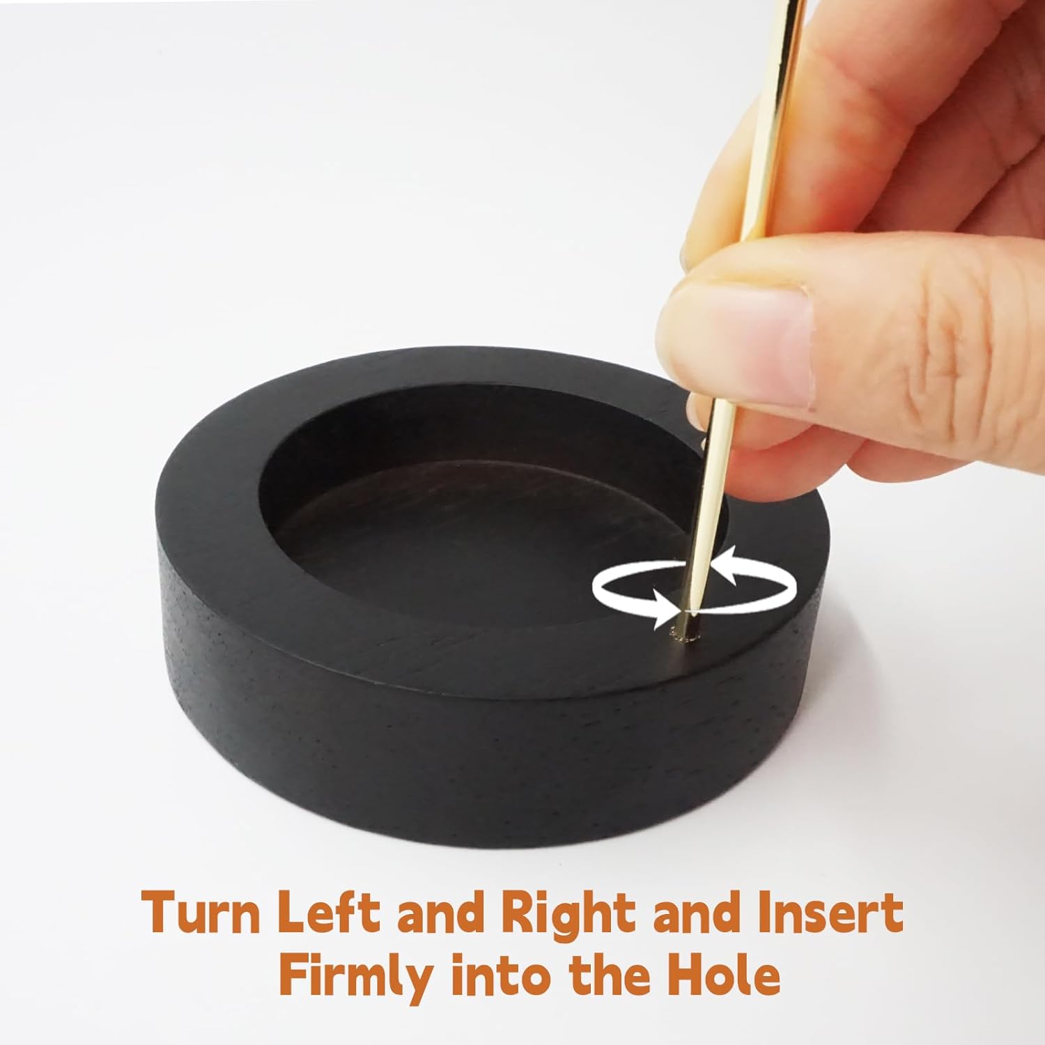 - Package Includes: Glass ash catcher, brass support rod,wood base, base gasket, and 30 incense sticks. The base hole may be tight initially, so a little forcefully rotate the support rod when inserting it.