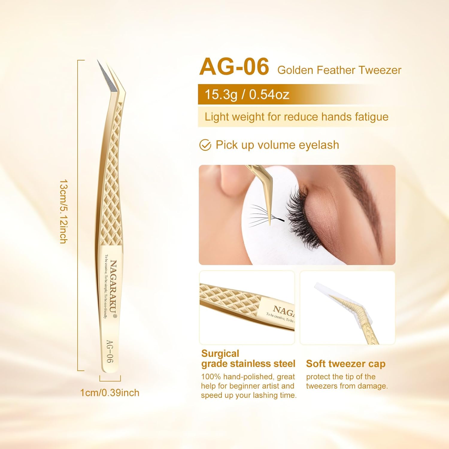 NAGARAKU Eyelash Tweezers, Precision Fiber Tip Tweezer for Eyelash Extensions Diamond Grip Anti-Static Anti-Slip Premium Gold Stainless Steel Pointed Eyelashes Tweezers with Box -Curved Tweezer AG-06
