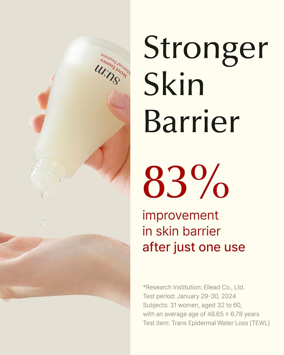 - SU:M SECRET ESSENCE (80ml/2.71fl oz) - This essence deeply hydrates and strengthens the skin's barrier, helping to enhance elasticity, smoothness, and natural vitality for a refreshed and youthful appearance.