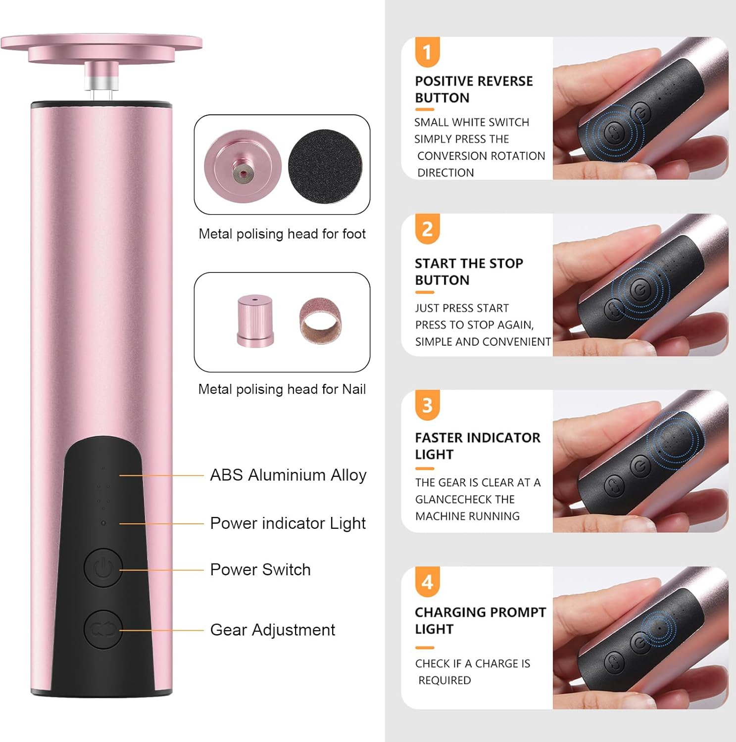 - 【Pedicure and Manicure Care】electric foot file its interchangeable dual heads, which enable the electric foot file to function not only as an efficient callus remover but also as a nail drill. This innovative foot callus remover tool consolidates the tasks of callus elimination and polish nails into a single, multi-purpose tool.
