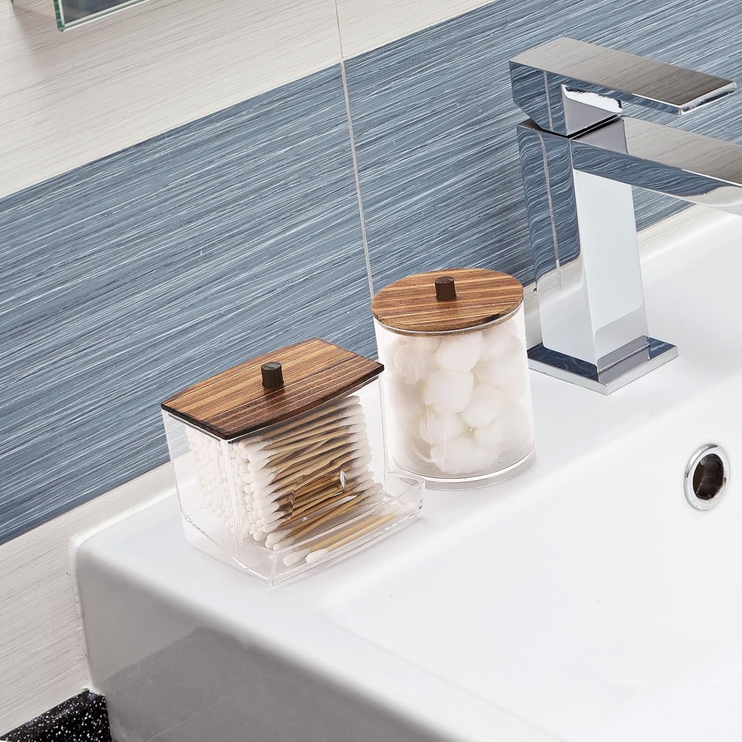 Tbestmax Qtips Dispenser, 10/12 oz Big Cotton Ball Holder Bathroom Container, Plastic Apothecary Jar Organizer for Storage Swab, Round Pads, Floss Picks - Wood Lids