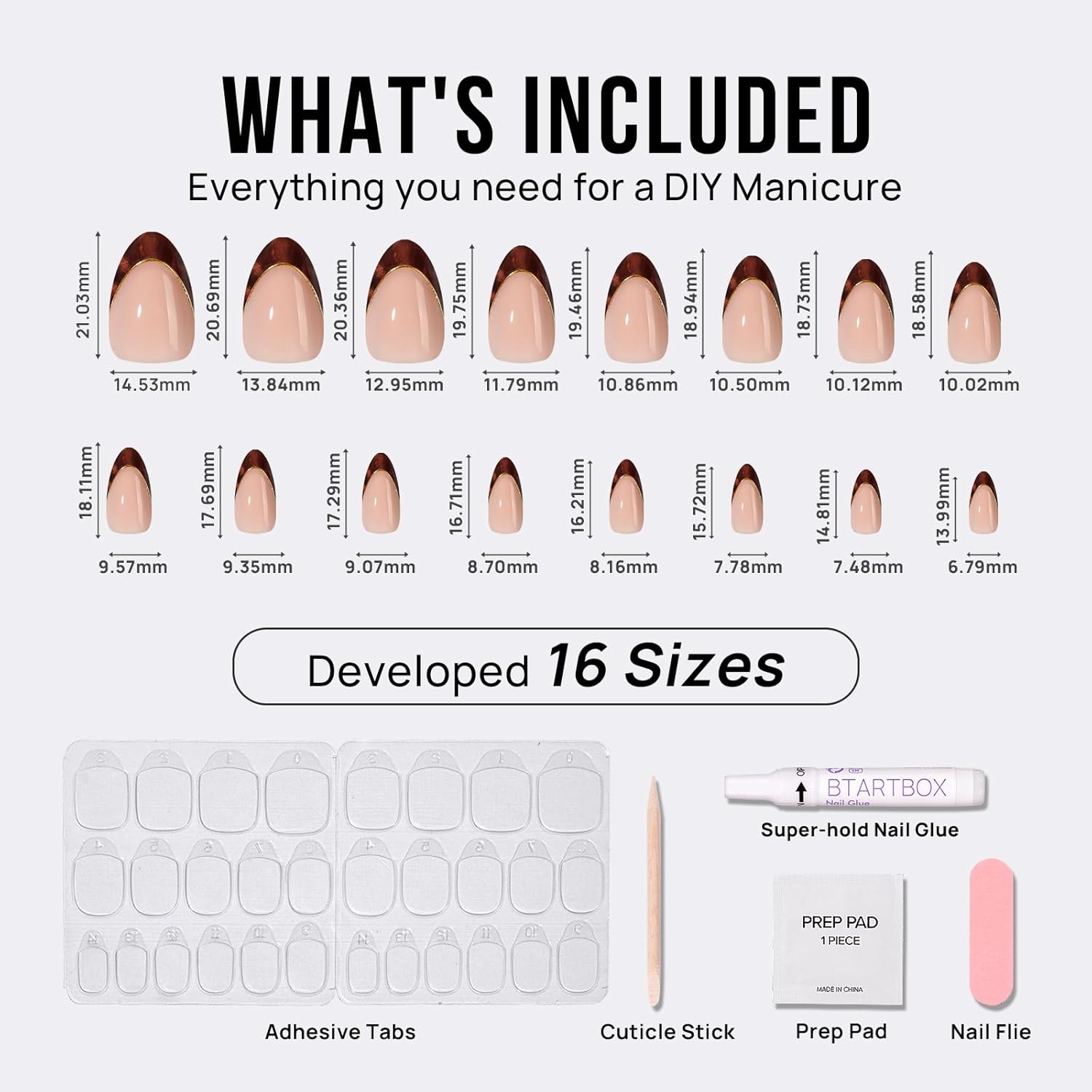 BTArtbox Press On Nails Short Almond - Winter French Tip Press On Nails, Soft Gel Fake Nails Brown, Reusable Glue On Nails with Nail Glue in 16 Sizes, Tortoise Shell