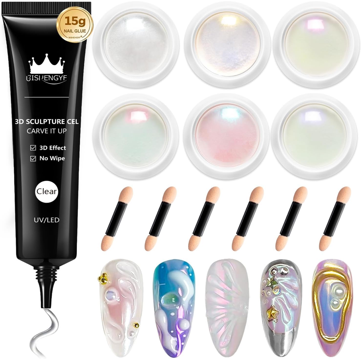 - 3D Nail Gel & Chrome Powder Kit: BISHENGYF upgraded 3D nail art sculpting gel kit include 15g clear nail sculpting gel, shiny white pink yellow green purple and orange chrome powders, and sponge sticks. Friendly for nail beginners and nail lovers, allows nail art beginners to create stunning nails at home and DIY enthusiasts for 3D gel nail art sculpture.