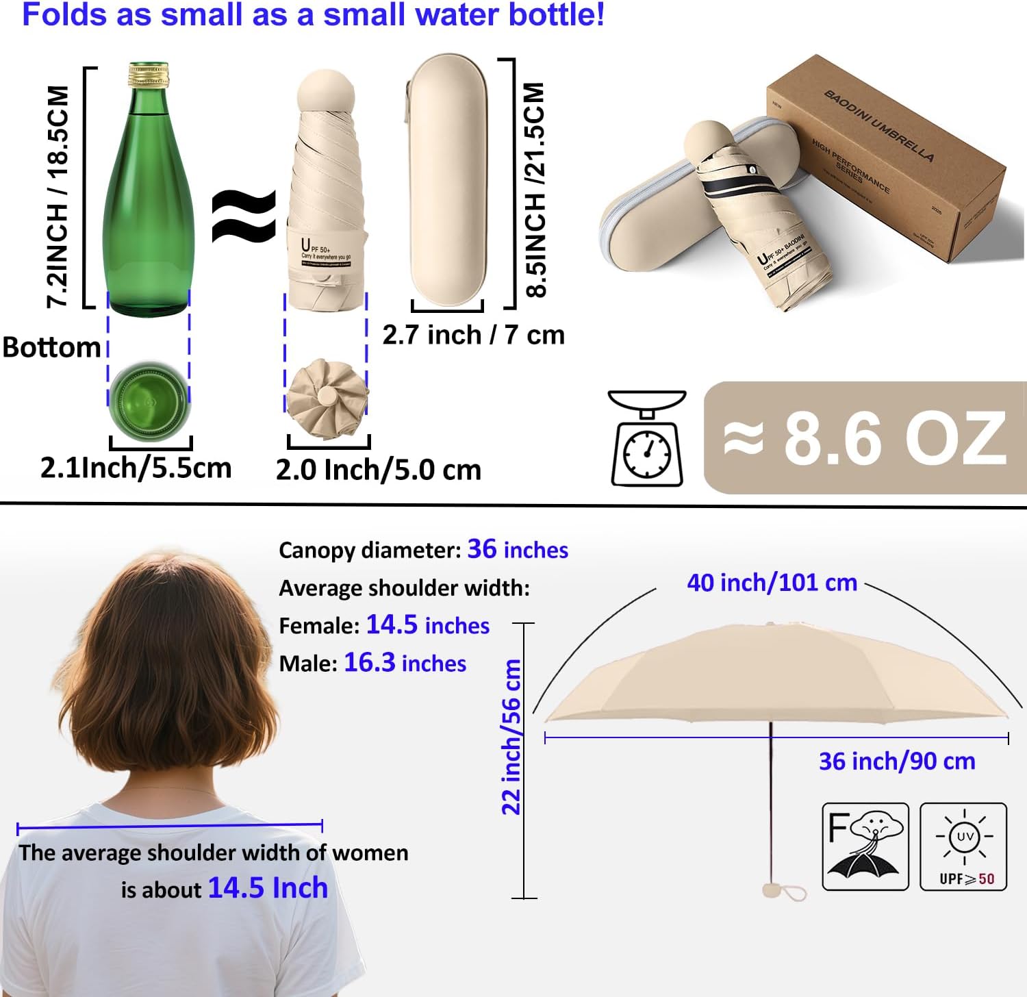 - Pocket umbrella: With a 40-inch arc and a 35.4-inch diameter, this mini travel umbrella is perfect for concealing in your purse or bag when you’re on the go! Folds to an ultra-compact 6.9 inches, makes the umbrella great for travel, as this super lightweight umbrella collapses about the size of your palm