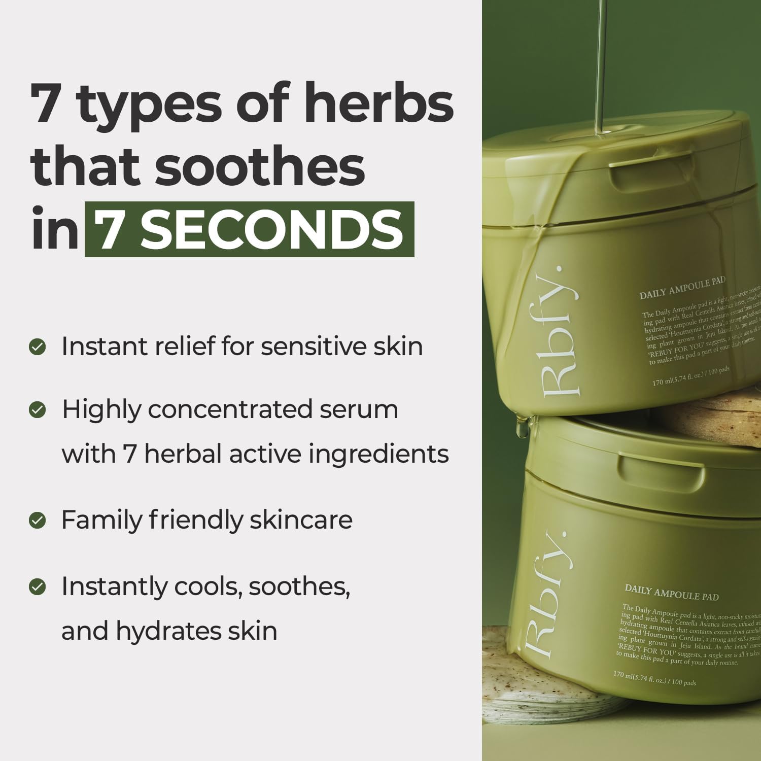 - Soothes & Calms Irritation: With calming ingredients such as Centella Asiatica Extract, Chamomile Extract, and Houttuynia Cordata Extract, the Rbfy. Daily Ampoule Pad helps reduce redness, irritation, and inflammation, promoting a clear, balanced complexion.