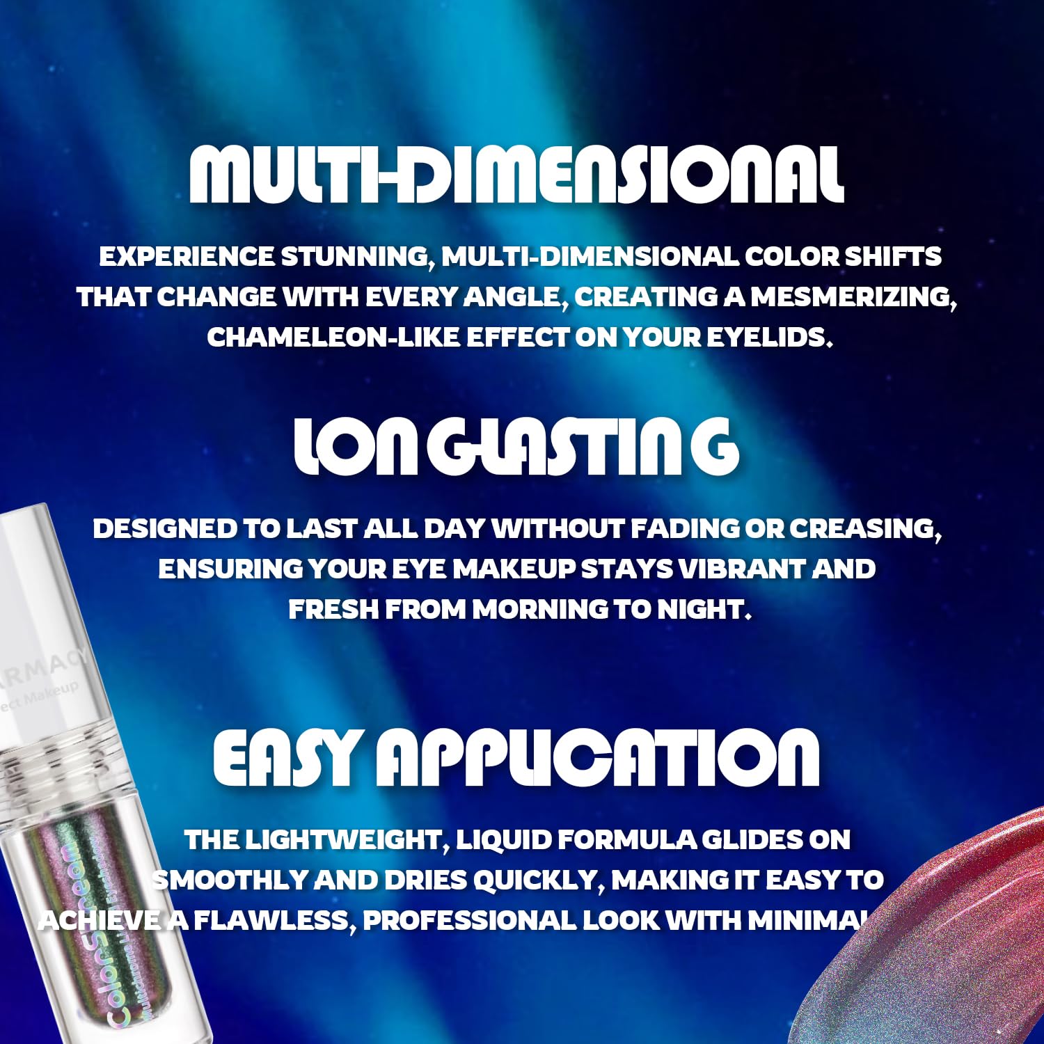 - 【CHARMACY Multichrome Liquid Eyeshadow】A multi-faceted, multi-dimensional and transformative liquid eyeshadow. The unrivaled three-tone multichrome finish takes your eyes to the next dimension with color-changing technology innovations and liquid structure, creating the illusion of professional multi-layered eye makeup.