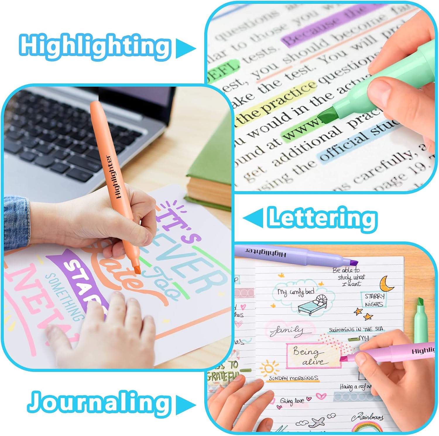 - Long Lasting & No Bleeding: The highlighters are designed to be used on a wide range of paper, such as newspapers, test papers, sticky note, notes, calendars, etc. Kid-safe, non-toxic, and won't penetrate typical paper. High-quality refills make coloring smoother and easier, and closing the pen cap after each use will make them more durable, more long lasting. Remember to be sure after use keep the pen cap closed to prevent the ink from drying out.