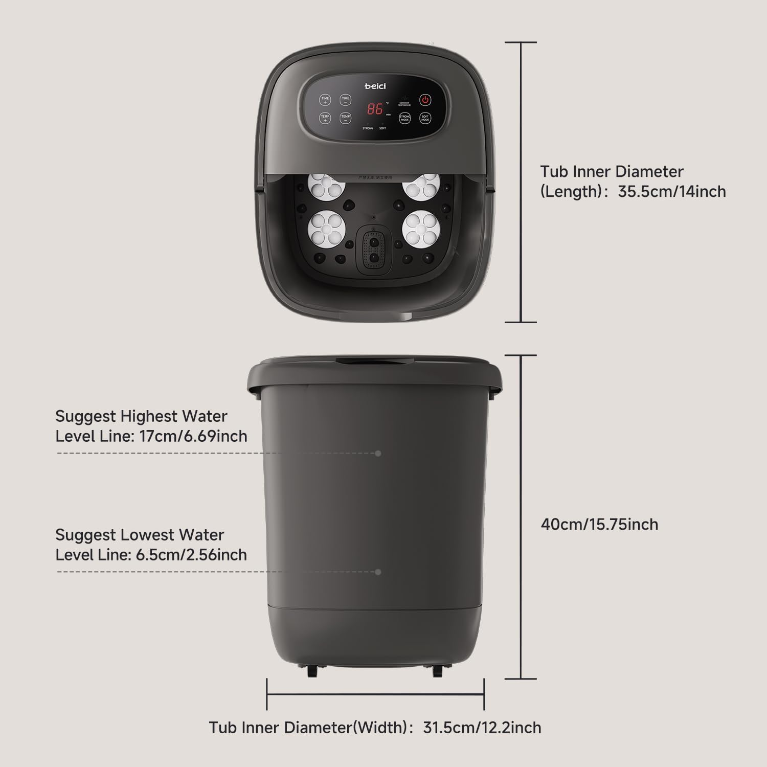 - PAY ATTENTION TO: Please add to enough warm water, or it will be more longer to heat. Tub Inner Diamete: Length:14in Width: 12.2in, which fit for up to 14in, provide a bigger space to put your feet. Rated voltage and power:120V 800W Frequency: 60HZ Material: PP