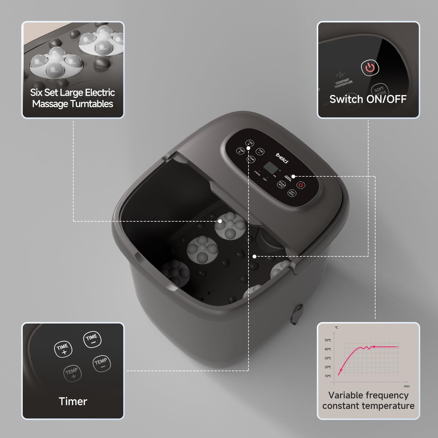 - Six Set Electric Rotary Massage Balls: This foot spa tub includes heating,vibrating,massage balls,shiatsu,and timer functions to relax your tired feet by differently massaging and touching mode