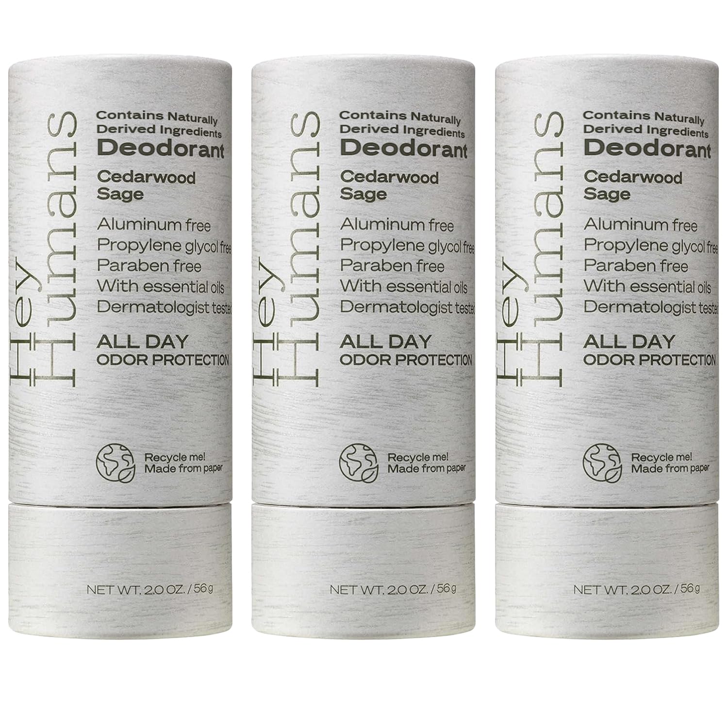 • Hey Humans deodorants for men and women are aluminum-free, paraben-free, phthalate-free, propylene glycol-free & silicone-free. They're also packaged in easily recyclabe paper for sustainability.