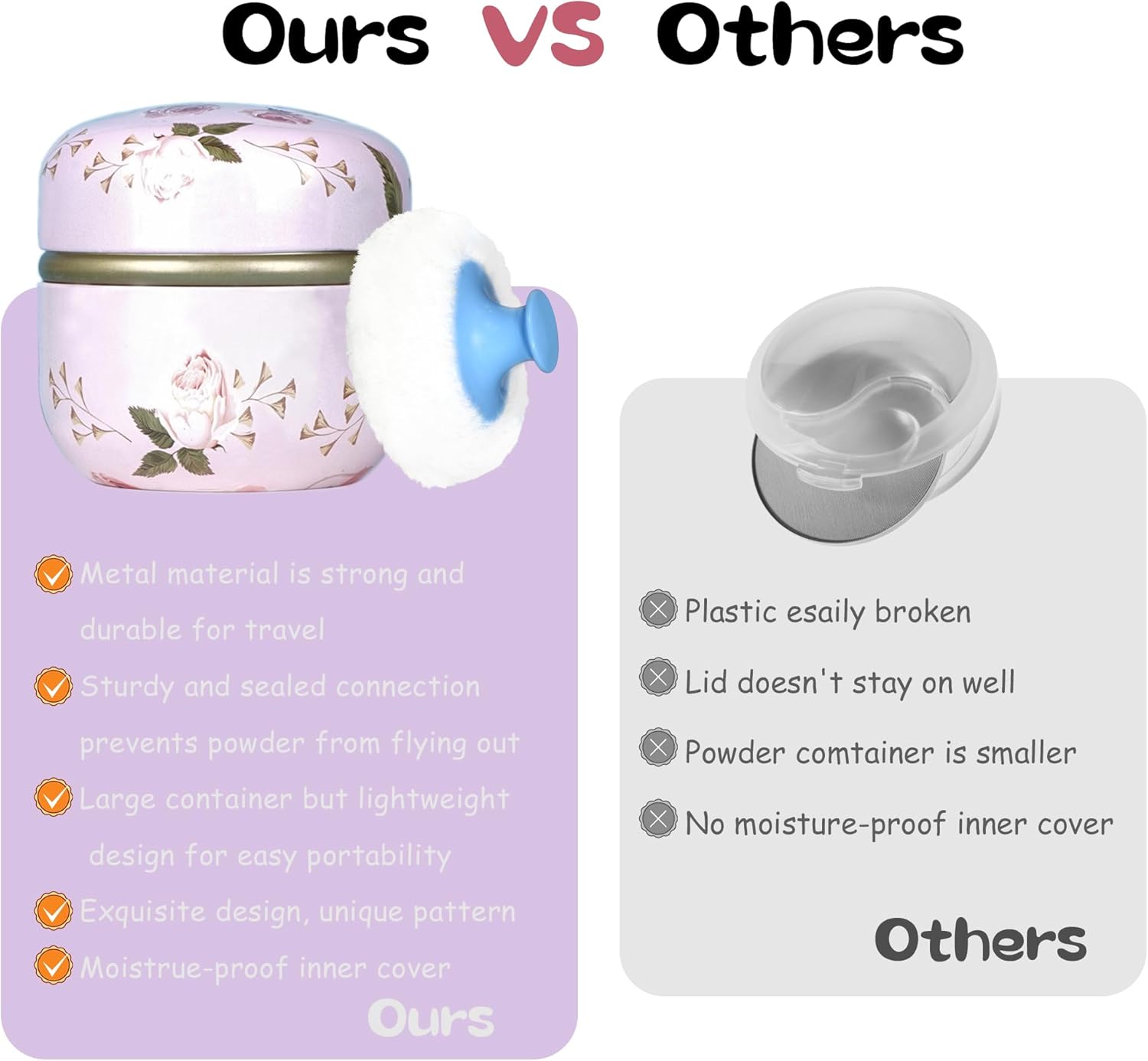 - Product contains a well-made powder case, a high quality powder puff with a handle and a small powder puff.