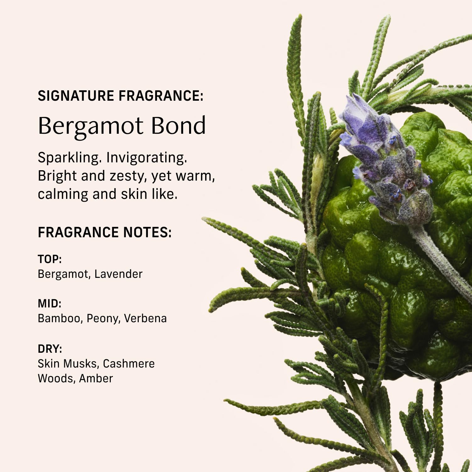 - BERGAMOT BOND SCENT: Bergamot, verbena, and cashmere woods create a refreshing yet subtly warm scent that feels like a morning walk in the forest. We developed Bergamot Bond for an all-day scent that’s sparkling, invigorating, and zesty with a hint of warmth.