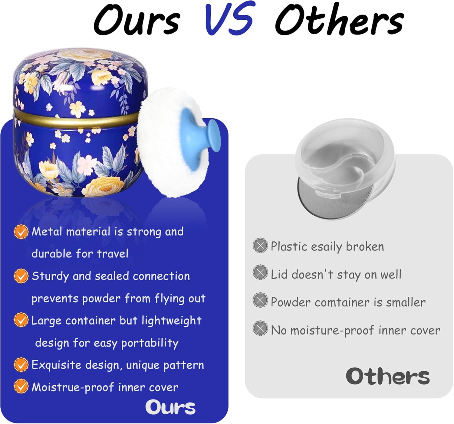 - Product contains a well-made powder case, a high quality powder puff with a handle and a small powder puff.