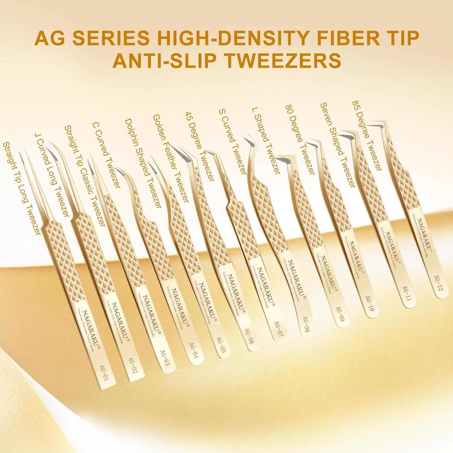 NAGARAKU Eyelash Tweezers, 1 Pair Precision Fiber Tip Tweezer for Lash Extensions Volume Grip Tweezers Antistatic Straight Curved Tip Stainless Steel with Box -Dolphin & L Typ Tweezers AG-05 & AG-09