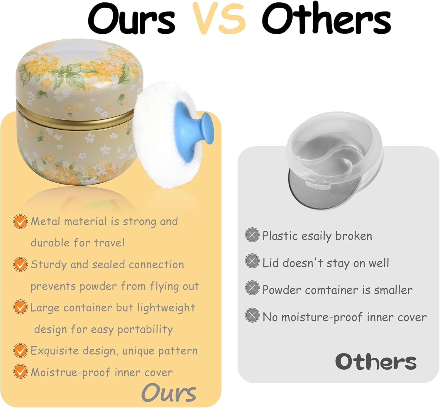 - The powder box has a delicate appearance and a variety of patterns for you to choose. The powder box is made of high-quality tinplate, which are not easy to break after being dropped, and not fade easily, and can be used for a long time. There is also a lid inside the powder box, so you don't have to worry about spilling powder.