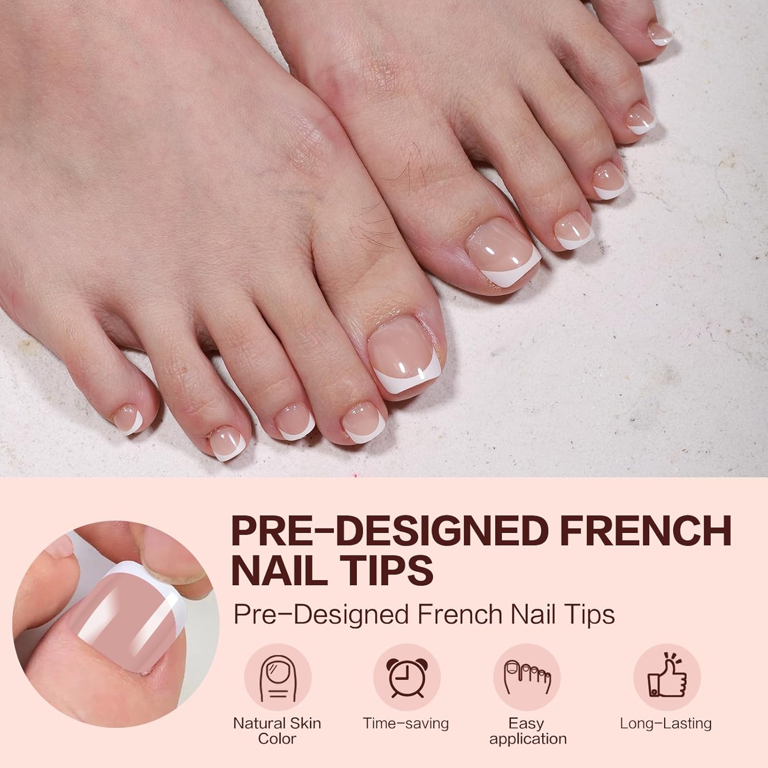French Tip Press on Toenails 144PCS with 4 Strips, 18 Sizes Pink Fake Nails - No Need to File, Pre-applied Primer, Short Square Toe Nails Kit for Women Pedicure & Gift