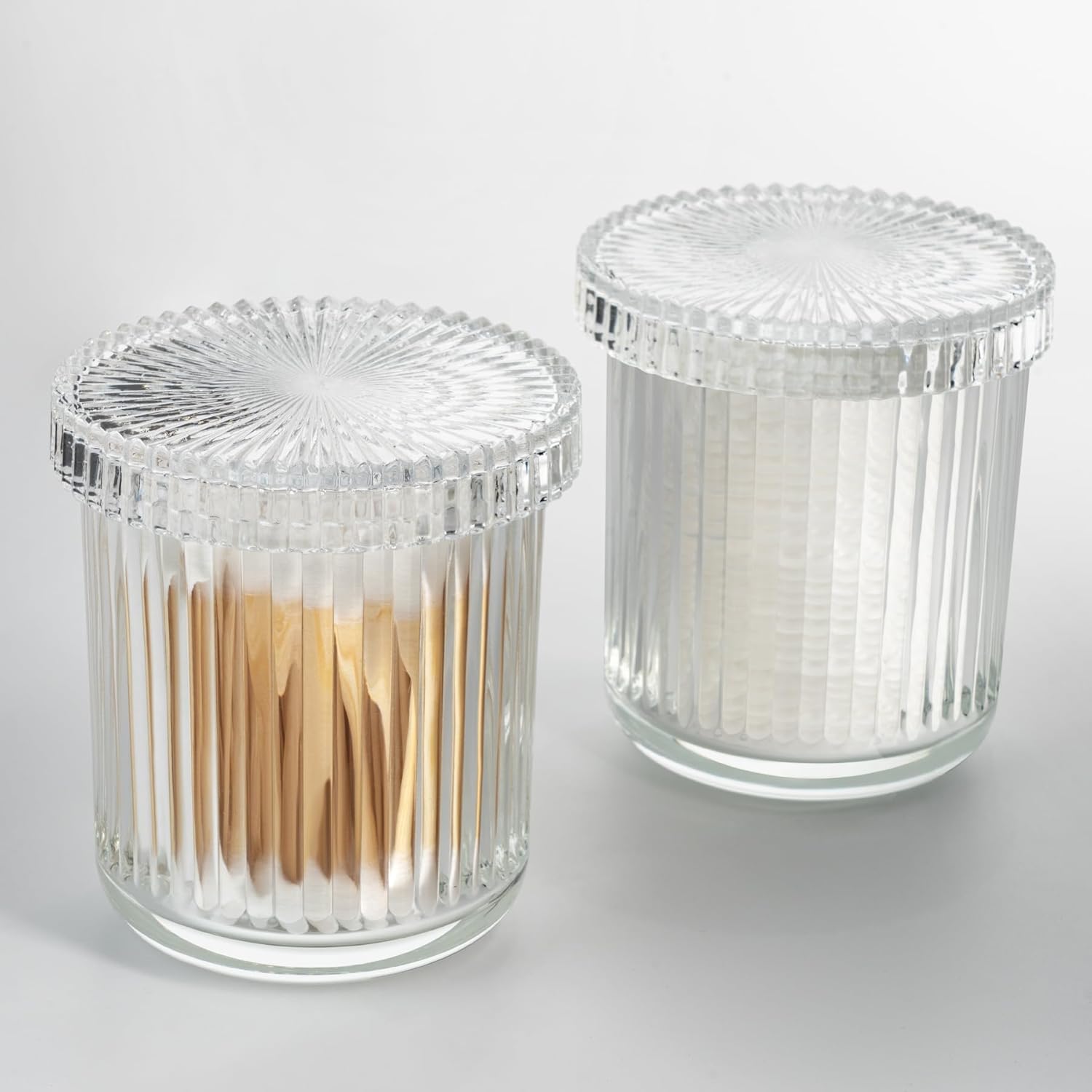 - PREMIUM GLASS APOTHECARY JARS - Made of thick, durable glass, this bathroom canister is sturdyand long-lasting. Clear stripe design makes it easy to see contents while keeping a modern, elegantlook. Must-have vanity organizer and bathroom accessory