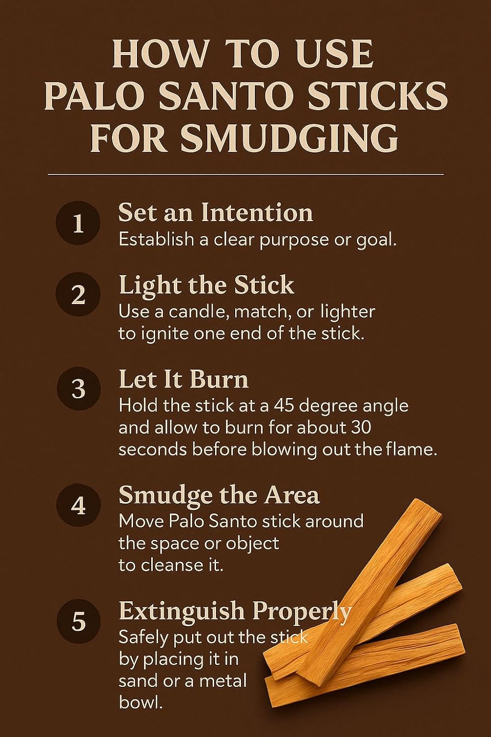 - ✅ Use a match or a lighter to ignite your Palo Santo. Hold your Palo Santo at a 45 degree angle with the point of the stick touching the flame. Let the wood stay lit for 30 seconds, and then blow the flame out. Allow the smoke to fill the space that you need to cleanse. When you are finished, lay the wood with the ignited tip downward in a bowl. It will put itself out.