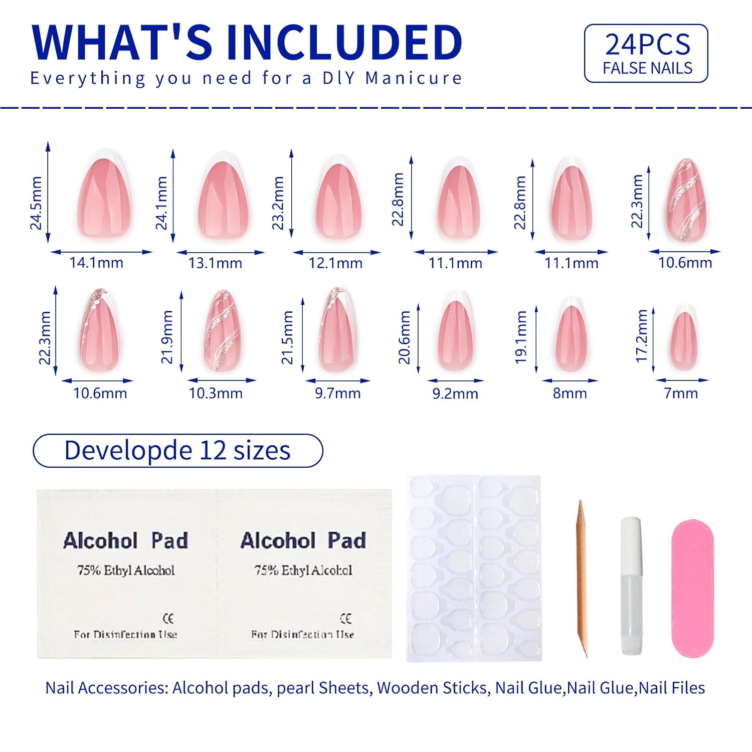 - Package Includes: 24 pcs stick on false glue on nails kit, each box includes 24 short press on nails, 1 sheet of 24 sticky nail pieces, 1 cuticle stick, 1 double sided nail file and gel press on nails cleaning pads, a small tube of nail glue,All the tools you need to apply the nails are included in one set