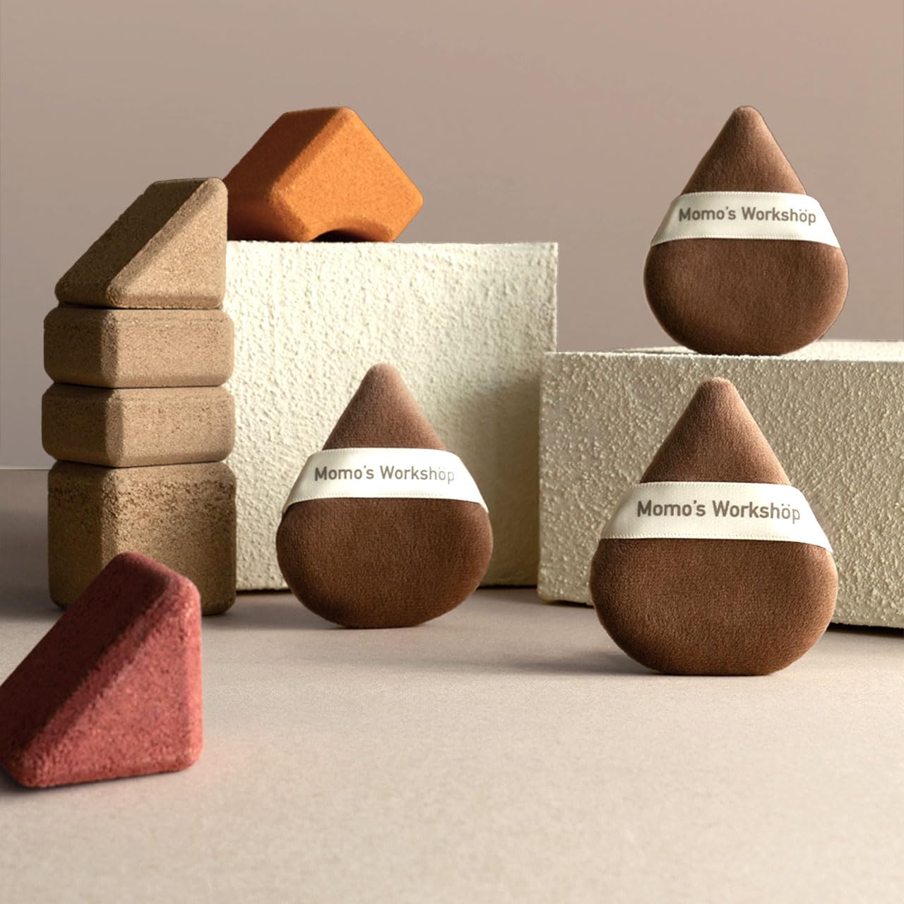 Momo's Workshop Pointed Powder Puff Large Size - Narrow Tip for Precision, Egg-Shaped Base for Even Application, Double-Sided Short Fluff, Works with Powder/Blush/Highlighter,Storage case,3PCS Puffs