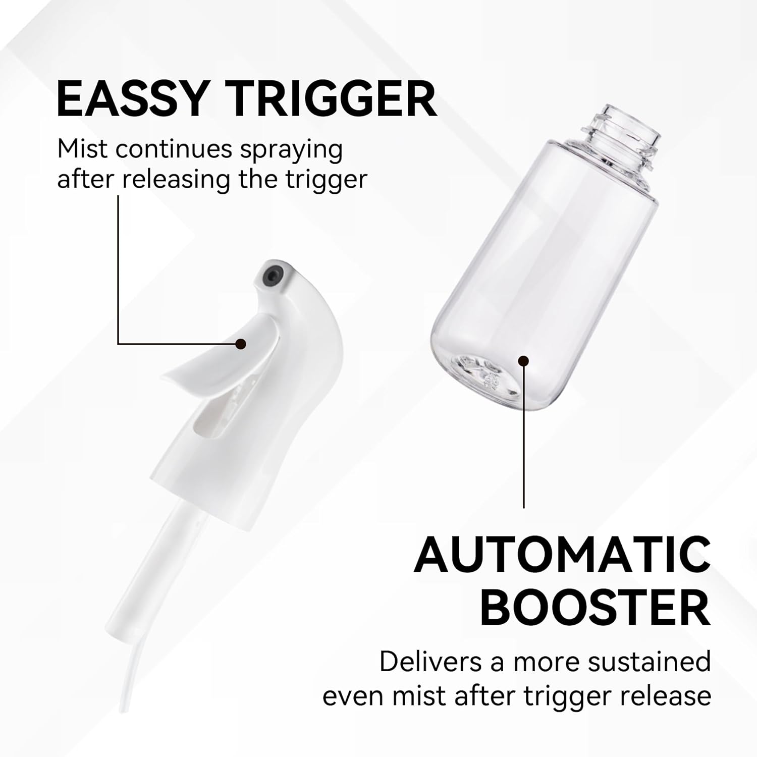 - Continuous Spray: The continuous spray bottle is engineered with robust pre-compression technology, which produces a mist stream that lasts for several seconds with just a few gentle presses.