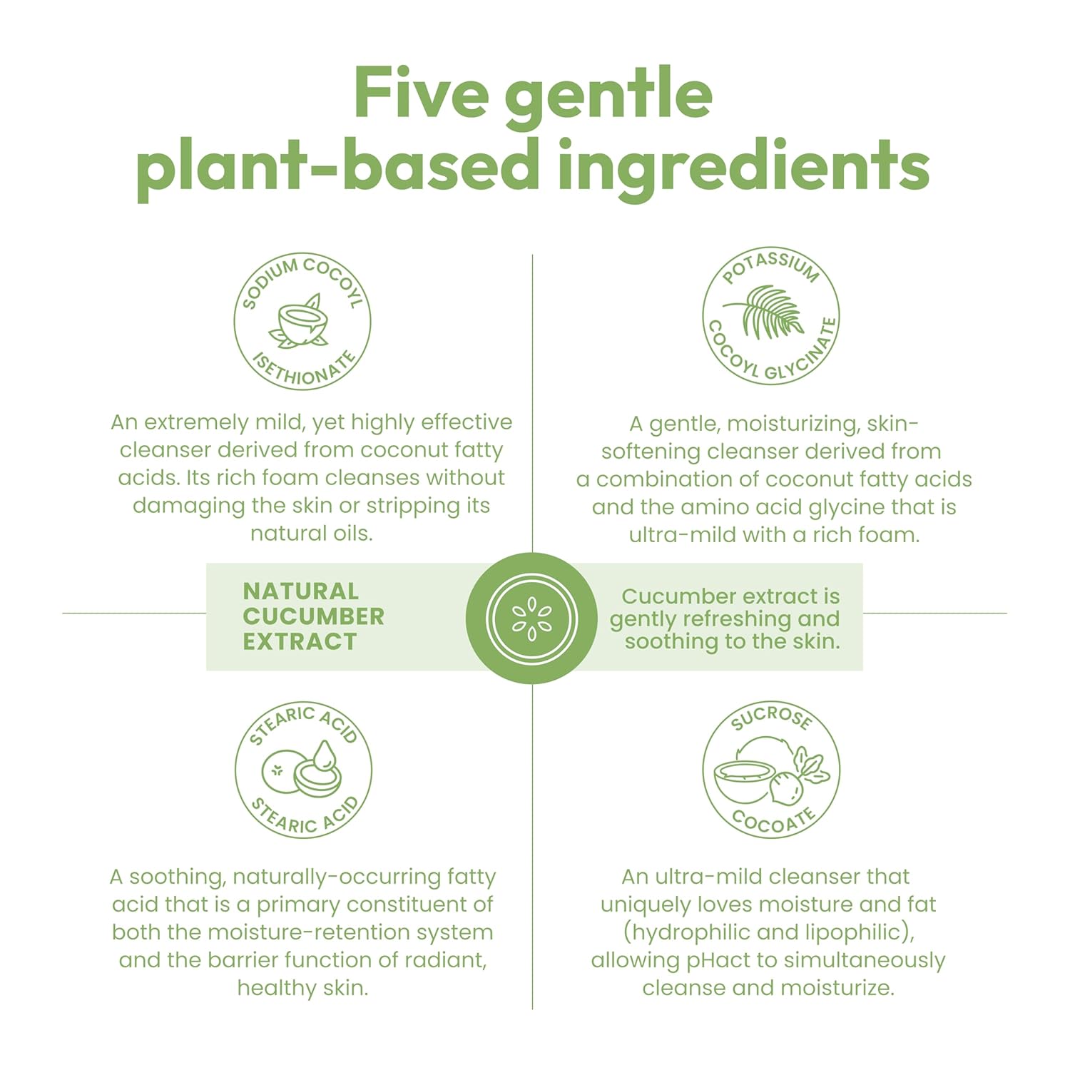 - pHact is a unique soap-free, moisture-rich, natural skin pH cleansing bar. Its rich lather provides a gentle, yet highly effective cleansing experience that will not dry or irritate the skin. pHact is made with only five plant-based ingredients and it is uniquely dermatologist, pediatrician, ophthalmologist and gynecologist tested. pHact Cucumber is infused with natural peppermint extract, leaving your skin feeling gently refreshed with every wash.