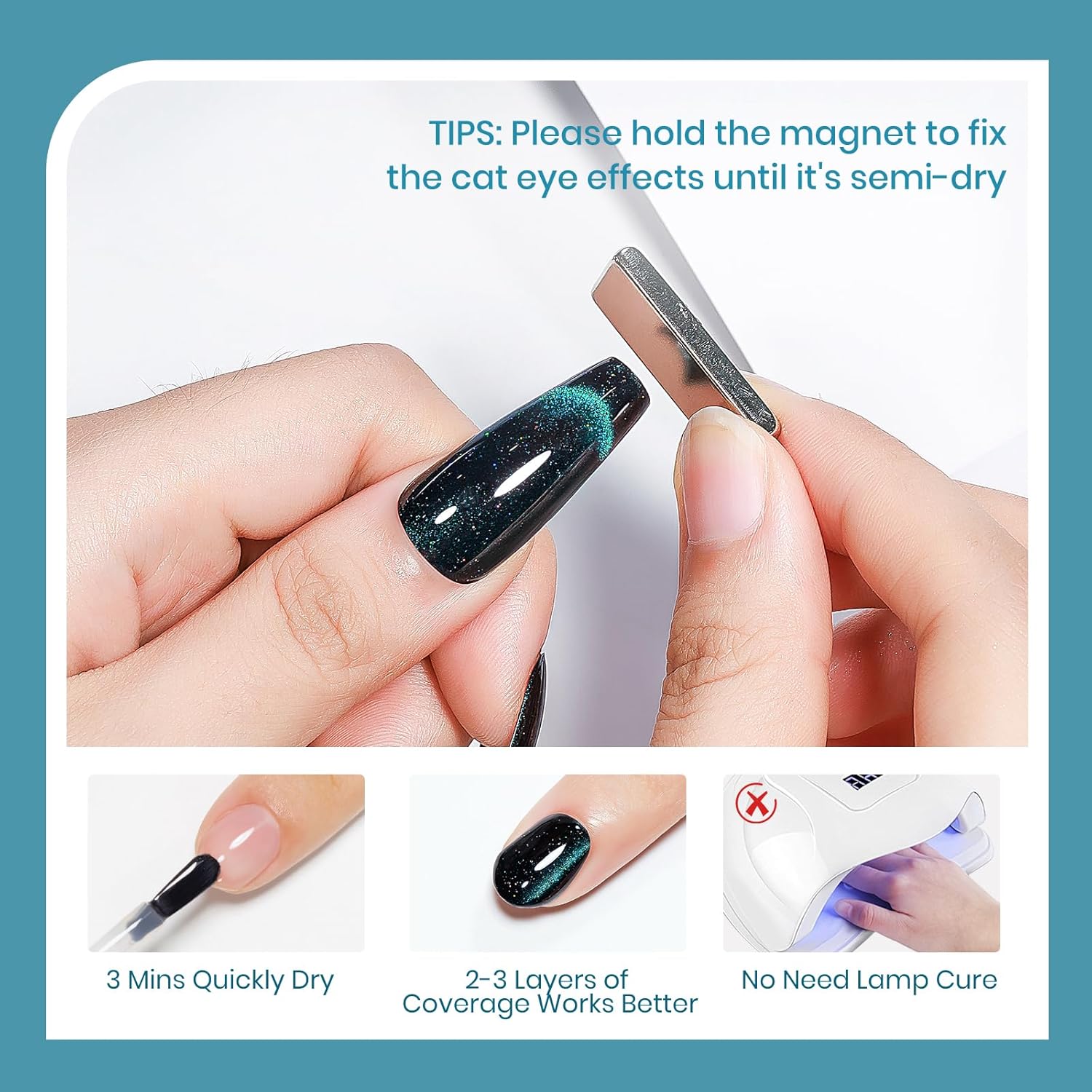 - Quick Dry Cat Eye Nail Polish: This magnetic nail polish set includes large capacity 16ml (0.54fl oz) shimmering cat eye nail polish and 1 magnetic stick. The wide magnetic stick is perfect for creating a variety of charming cat eye patterns to add color to your manicure.