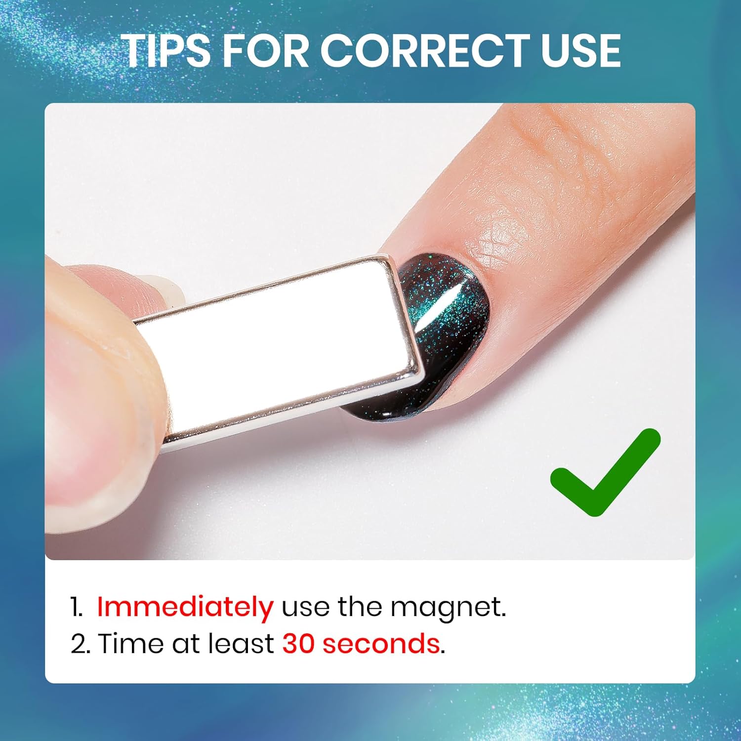 - Important Tips: 1. When the nail polish is not dry yet, it will be fluid. Use magnets to hold it in place until it's semi-dry, then take them off for a sharp cat-eye look 2. Do not touch water or hit the nail surface within two hours after finishing to avoid peeling; 3. Base and top coat nail polish art necessary