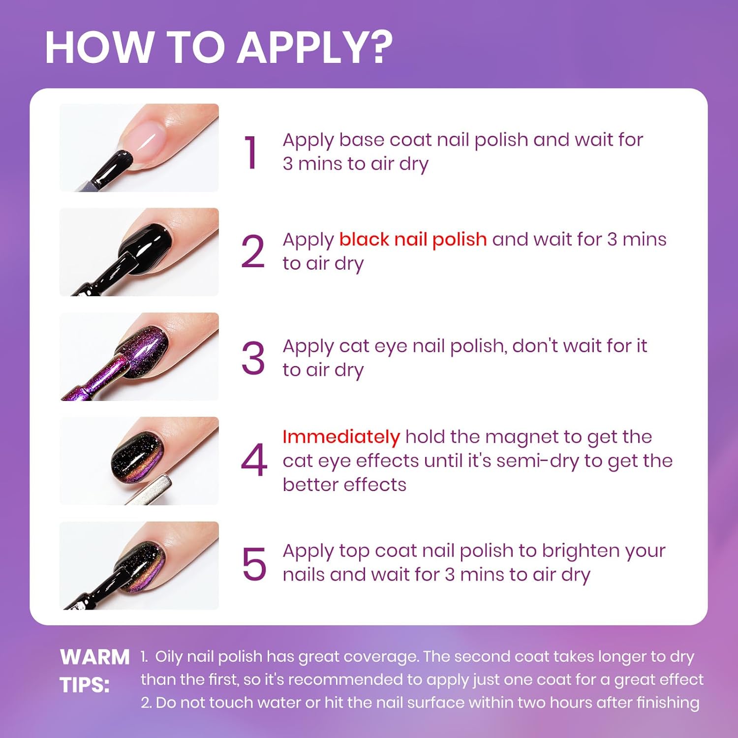 - Quick Dry Cat Eye Nail Polish: This magnetic nail polish set includes large capacity 16ml (0.54fl oz) shimmering black purple cat eye nail polish and 1 magnetic stick. The wide magnetic stick is perfect for creating a variety of charming cat eye patterns to add color to your manicure.
