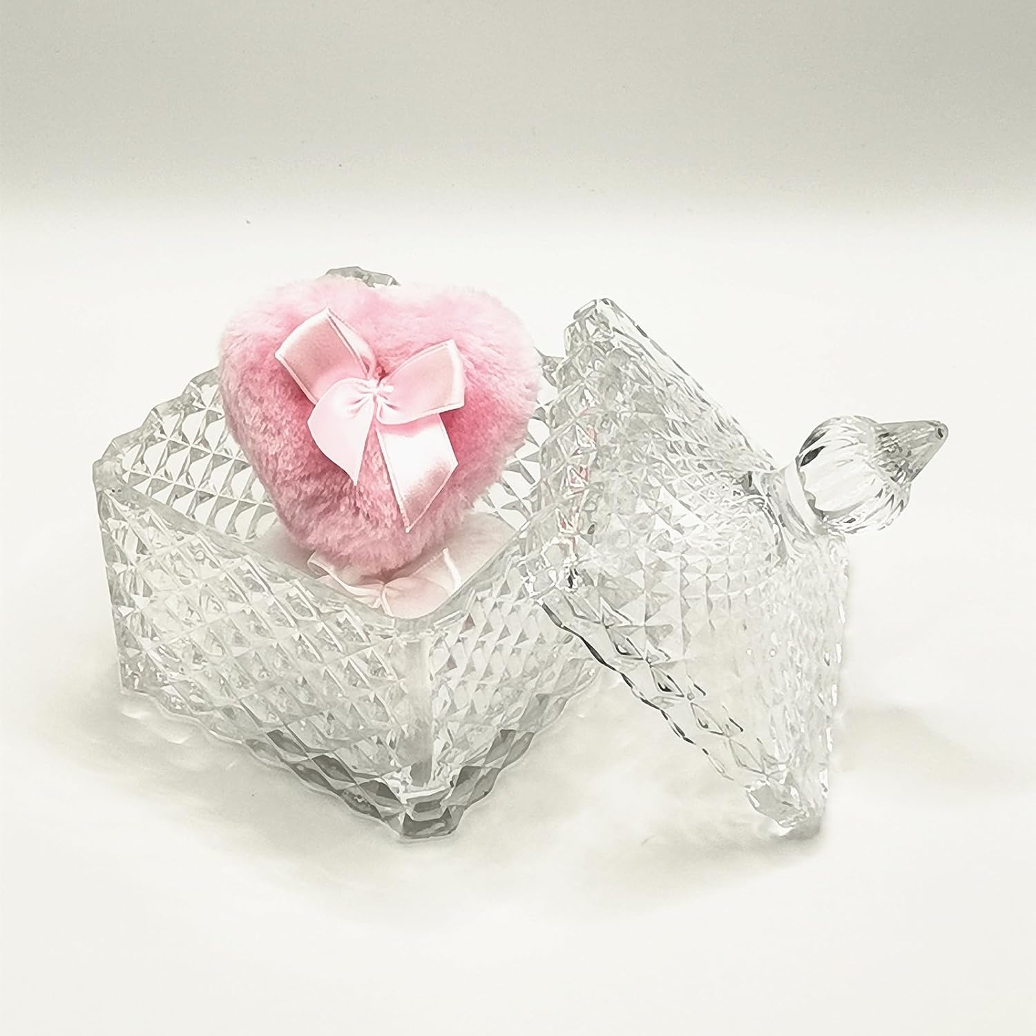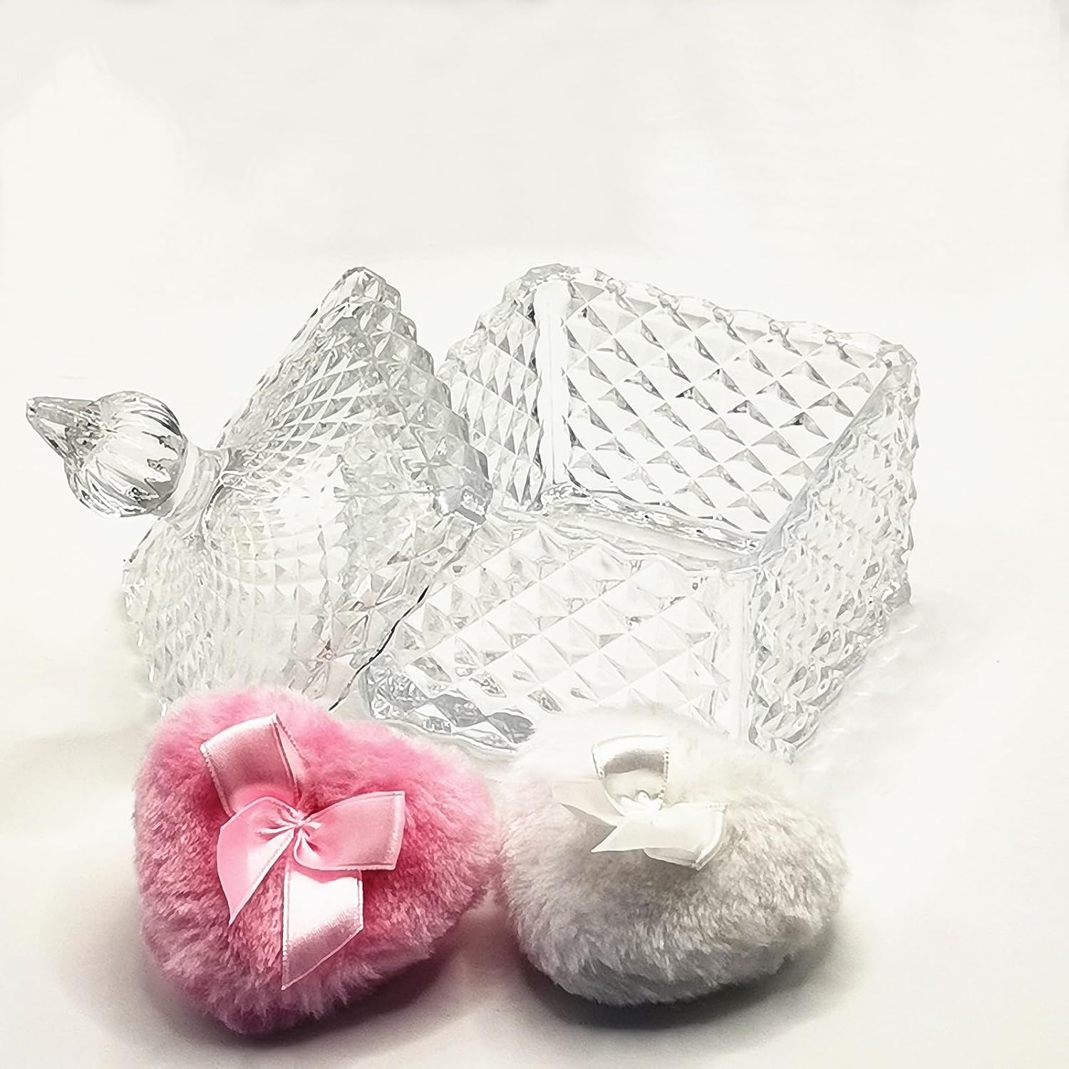 - 【You Will Get】 1 x Pink Glass Powder Puff Box with Reusable One White Puff and One Pink Puff. Transparent glass material with heart shape design, both aesthetics and ritual, suitable for gifts or makeup table decorations. The puff is soft and reusable, wet and dry use