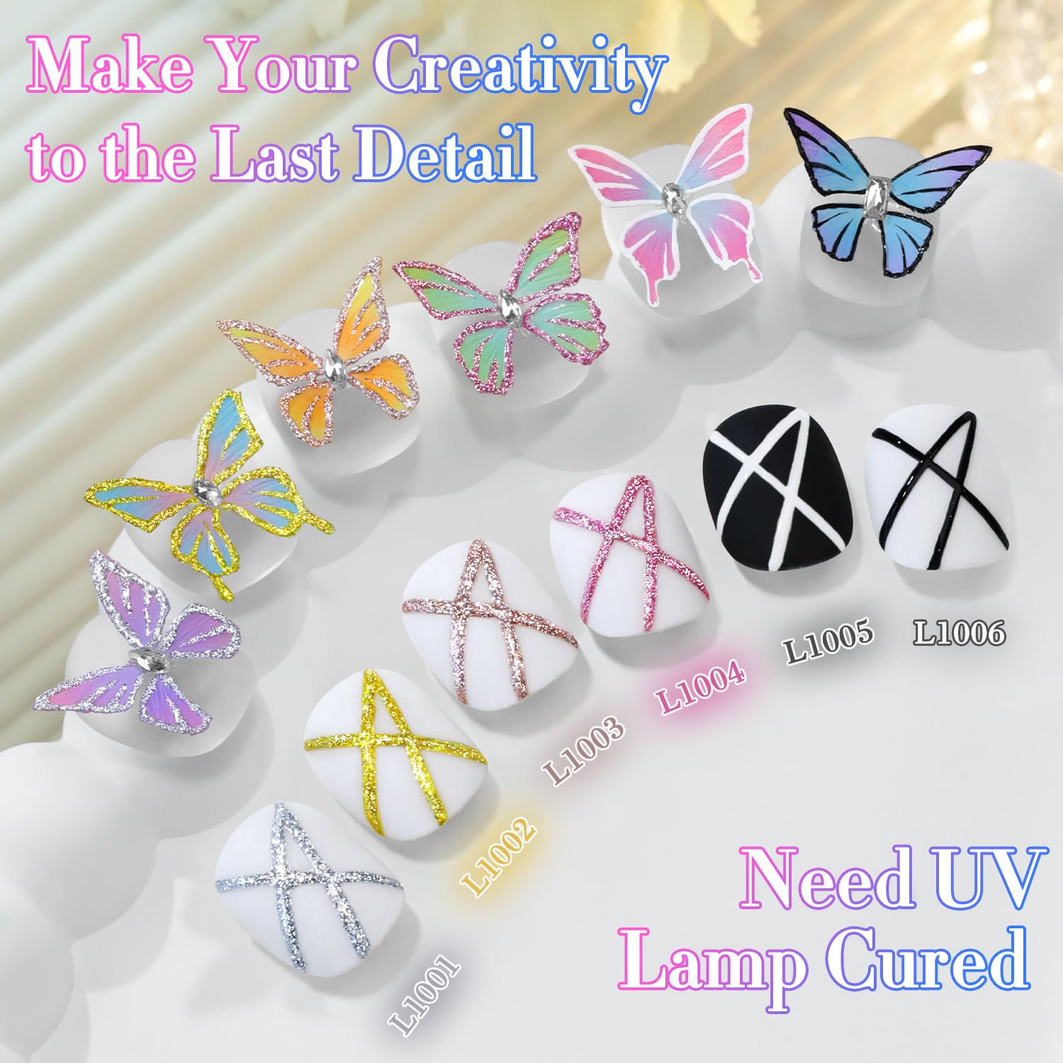 - 6 Pcs Gel Liner Art Polish: 6pcs 15ml gel polish for all season, will come with color swatches.These gel polish kit need to be cured under UV or LED Lamp for 60-138s. Must apply with Base Gel and Top Coat. Please shake the bottle or warm it with hot water before use, to acheive a better effect.