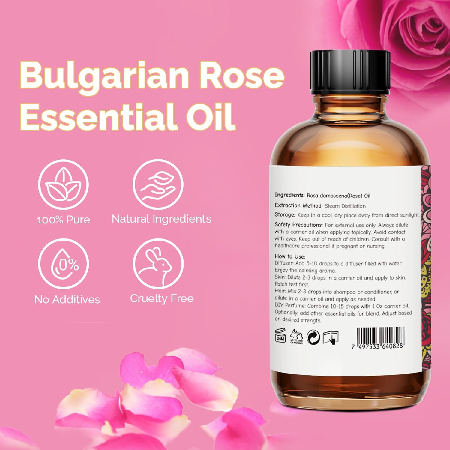 - 100% Pure & Natural Rose Essential Oil: Our premium 4oz Rose Essential Oil is steam-distilled from fresh rose petals, offering a rich, floral scent. Ideal for use as a pure rose oil for diffuser, massage, and skincare routines.