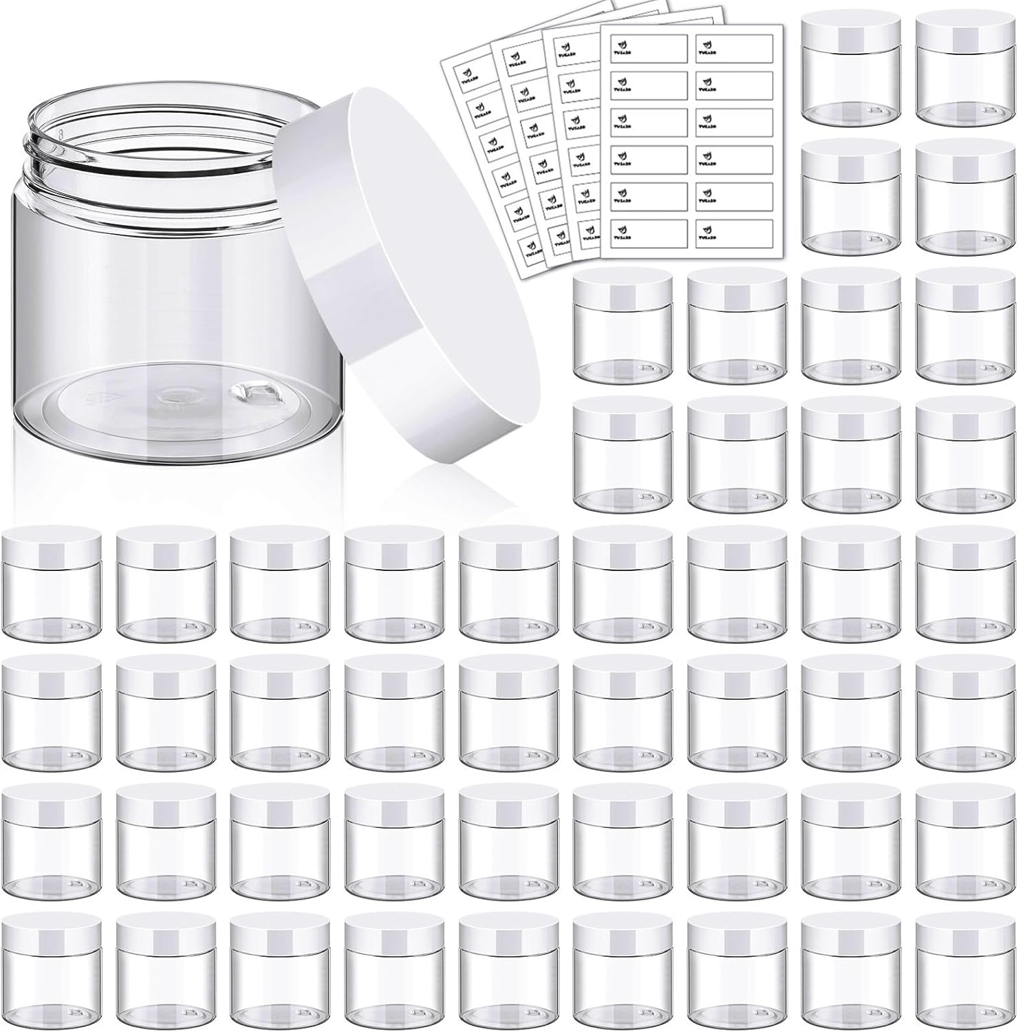 TUZAZO 48 Pack 2 Oz Small Plastic Container Jars with Lids and Labels BPA Free, Empty Round Clear Cosmetic Containers Plastic Slime Jars for Lotion, Cream, Ointments, Samples, Travel Storage (48)