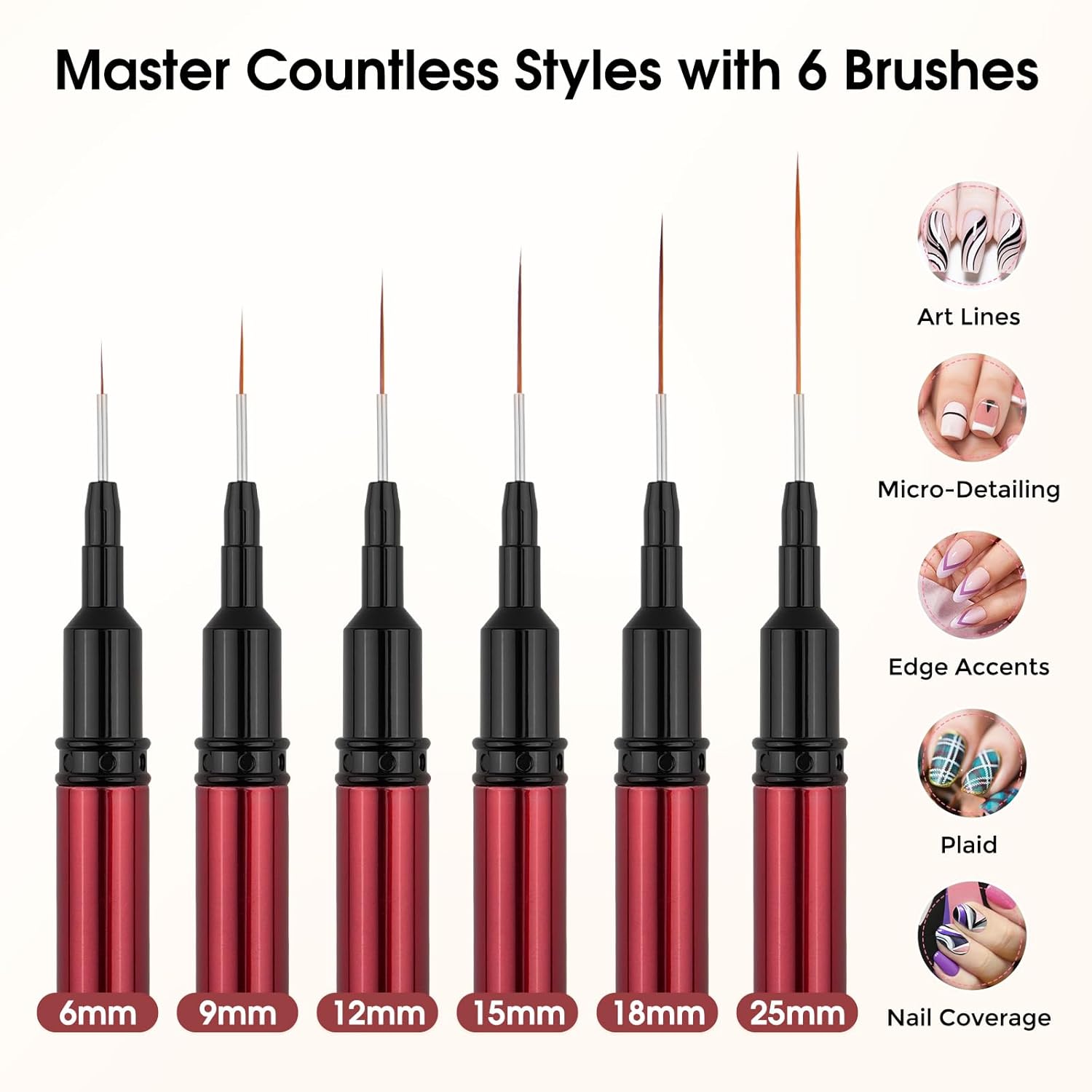 - 6 Sizes Nail Liner Brushes for Versatile Designs: The nail art brushes include 6/9/12/15/18/25mm. Each nail brush is engraved with a length indicator for easy identification. This range of lengths helps nail art enthusiasts to choose the most suitable nail brushes for their needs, allowing them to master various line lengths, contouring, and complex patterns effortlessly.