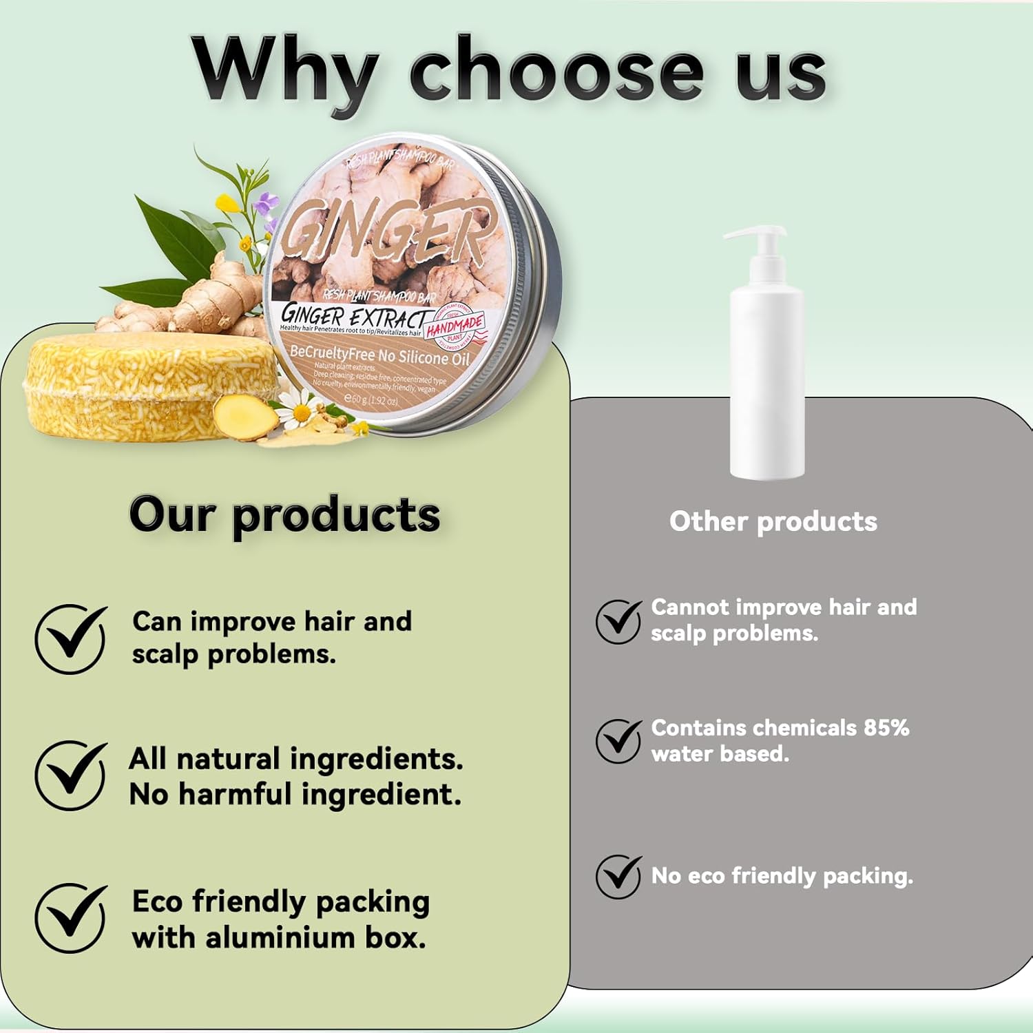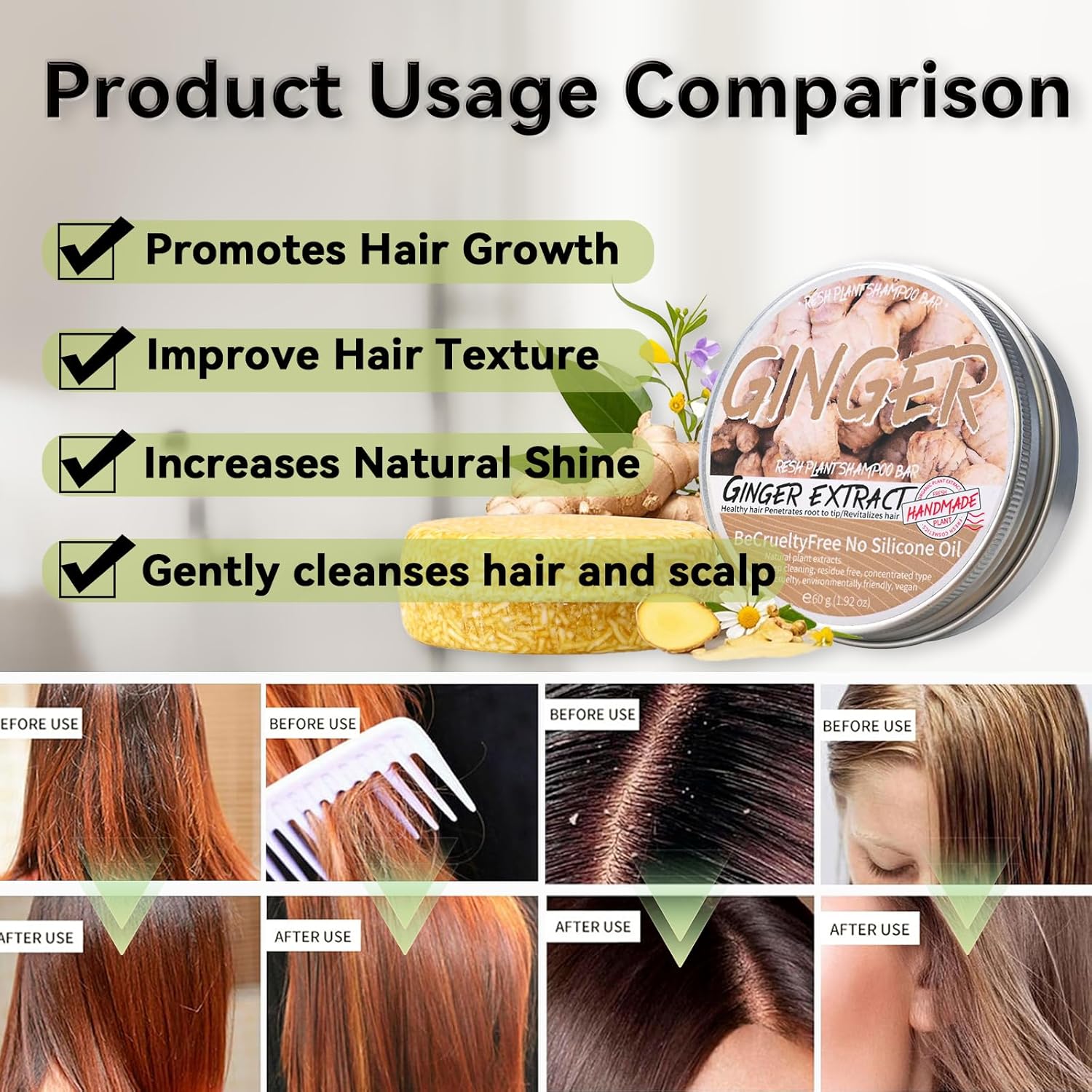 - 【Safe Ingredients】Ginger Shampoo Bar uses pure natural ingredients, including ginger extract, shea butter, olive oil, coconut oil, and other ingredients. It has a mild effect and does not hurt the scalp. Therefore, you can use it with confidence even if you have sensitive skin.