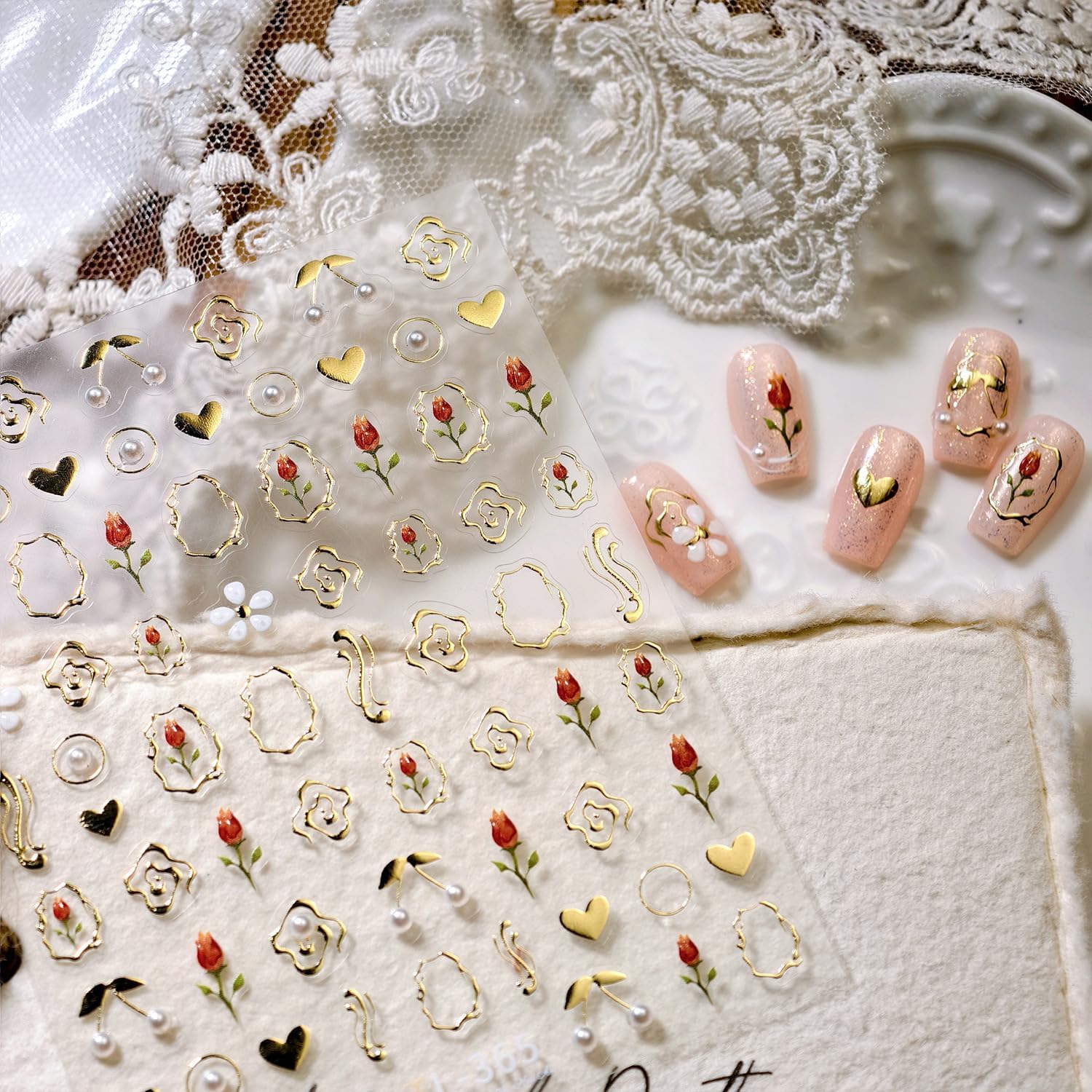 Gold Nail Stickers Flower Nail Decals for Nails Art Tulip Nail Art Stickers with Design Heart Nails Art Decals Self Adhesive Sticker for Women Girls Kid Manicure Charms Supply Accessories