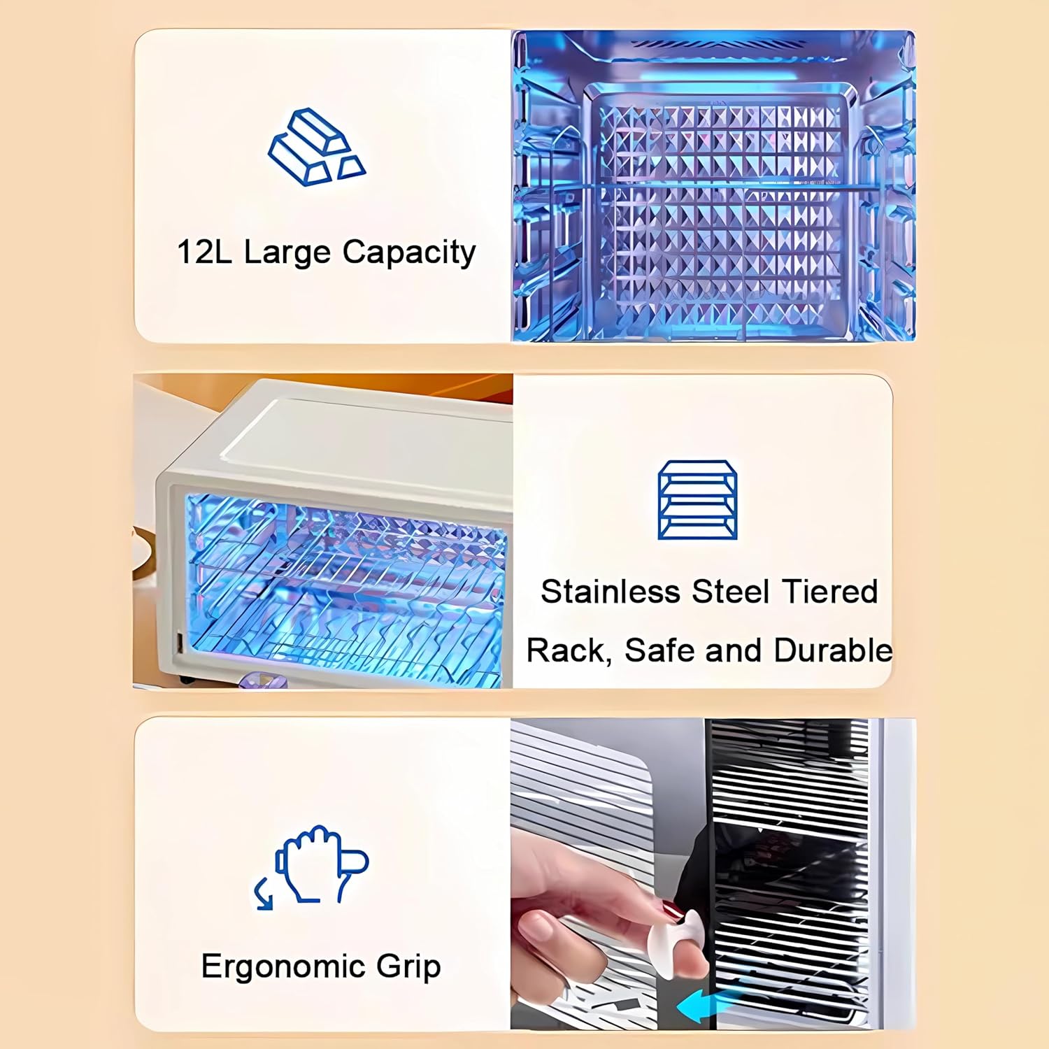 - Organized Storage with Removable Trays: The 12L interior with removable stainless steel trays helps you neatly arrange various items, from nail tools and razors to makeup brushes and personal care accessories,keeping your tools and accessories neatly stored and maintained is simple with this dedicated storage solution.