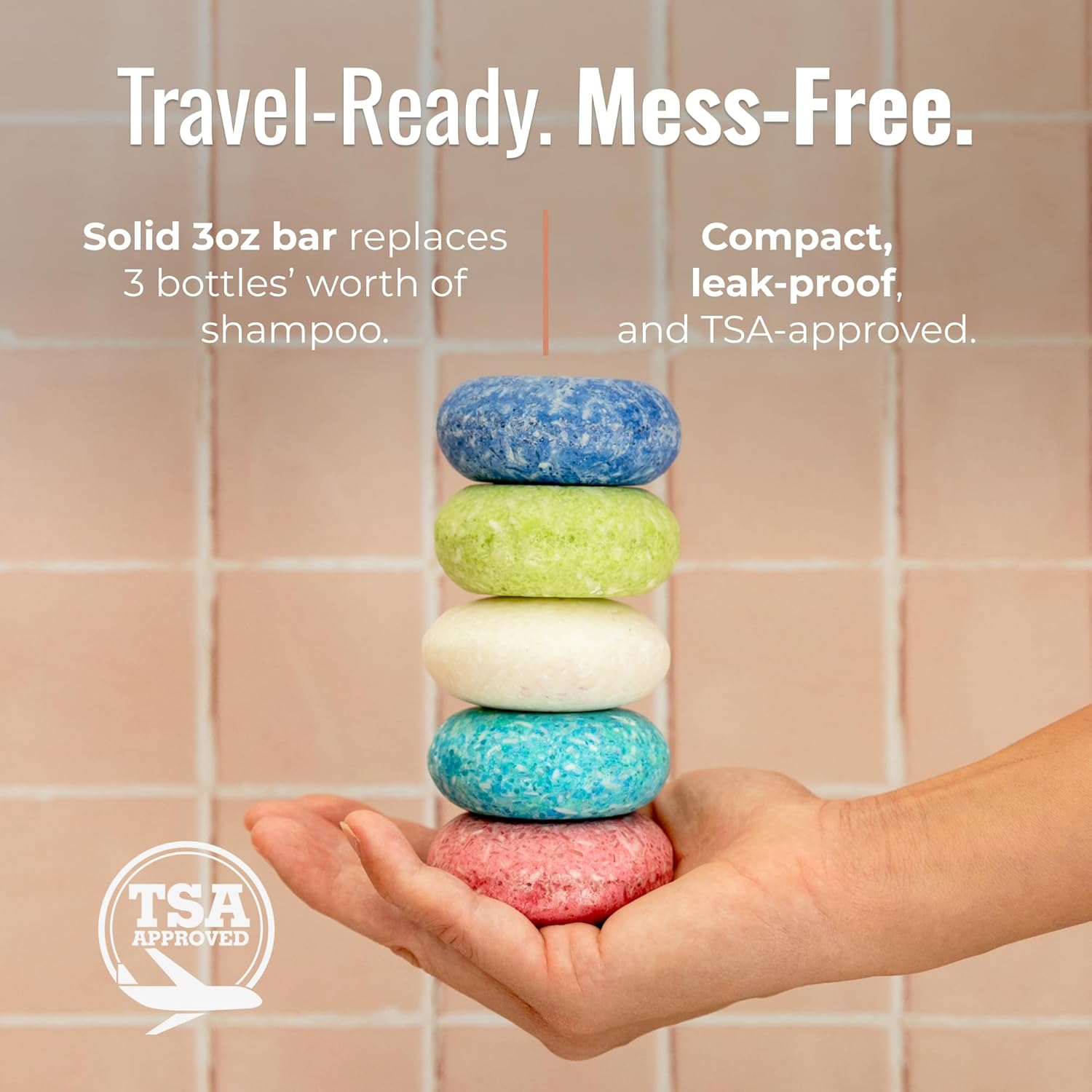 - TRAVEL-FRIENDLY, MESS-FREE: Compact solid shampoo bar fits easily into any toiletry bag; TSA approved and leak-proof for hassle-free travel and gym use